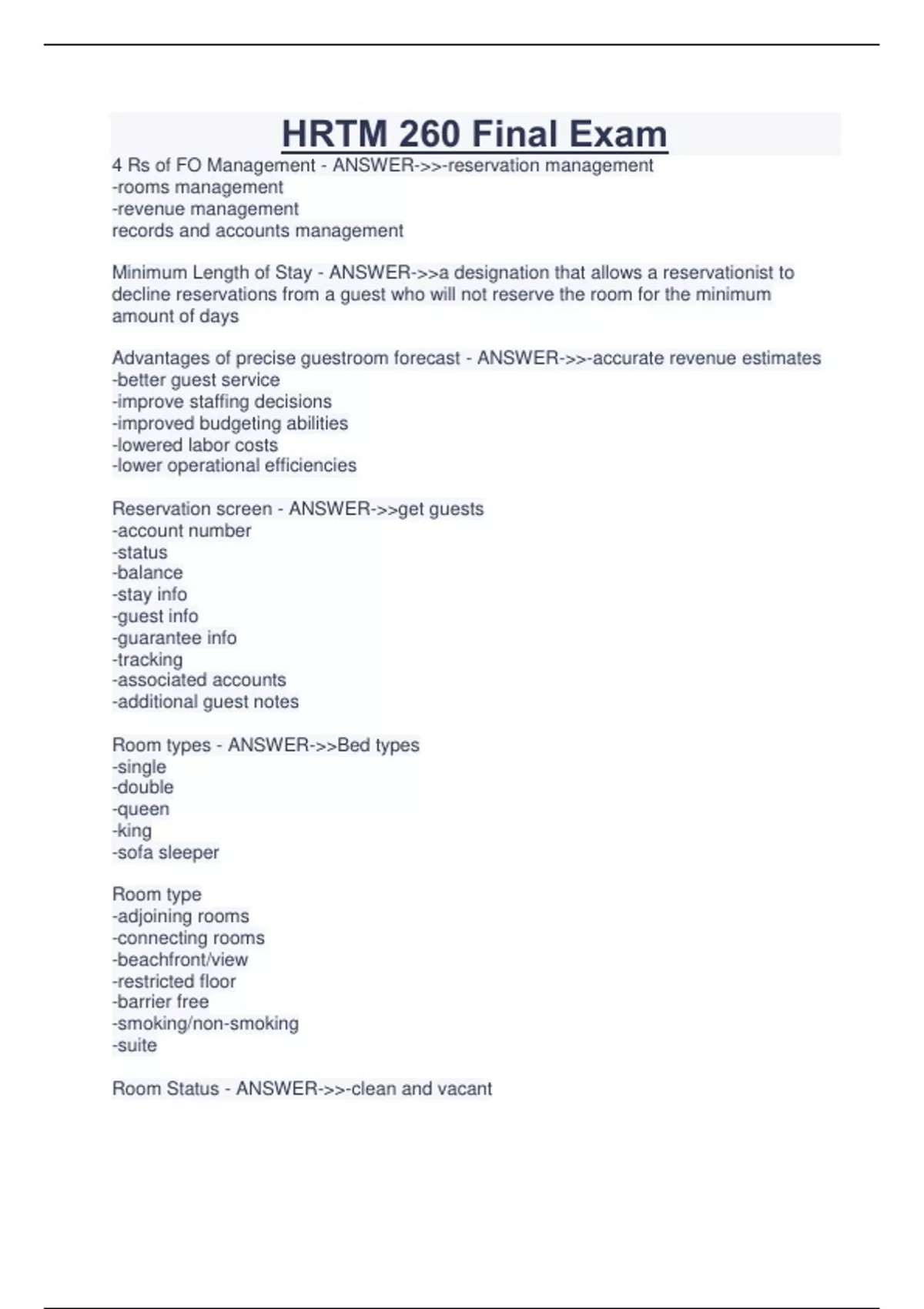 HRTM 260 Final Exam 4 Rs of FO Management - ANSWER->>-reservation management -rooms management -revenue management records and accounts management Minimum Length of Stay - ANSWER->>a designation that allows a reservationist to decline reservations from a guest who will not reserve the room for the minimum amount of days Advantages of precise guestroom forecast - ANSWER->>-accurate revenue estimates -better guest service -improve staffing decisions -improved budgeting abilities -lowered labor costs -lower operational efficiencies Reservation screen - ANSWER->>get guests -account number -status -balance -stay info -guest info -guarantee info -tracking -associated accounts -additional guest notes Room types - ANSWER->>Bed types -single -double -queen -king -sofa sleeper Room type -adjoining rooms -connecting rooms -beachfront/view -restricted floor -barrier free -smoking/non-smoking -suite Room Status - ANSWER->>-clean and vacant -occupied -on change -do not disturb -sleep-out -stayover -due out -check out -out of order -lock out -late check out When selecting a PMS what are the important characteristics FOMs should evaluate? - ANSWER->>-reliability...