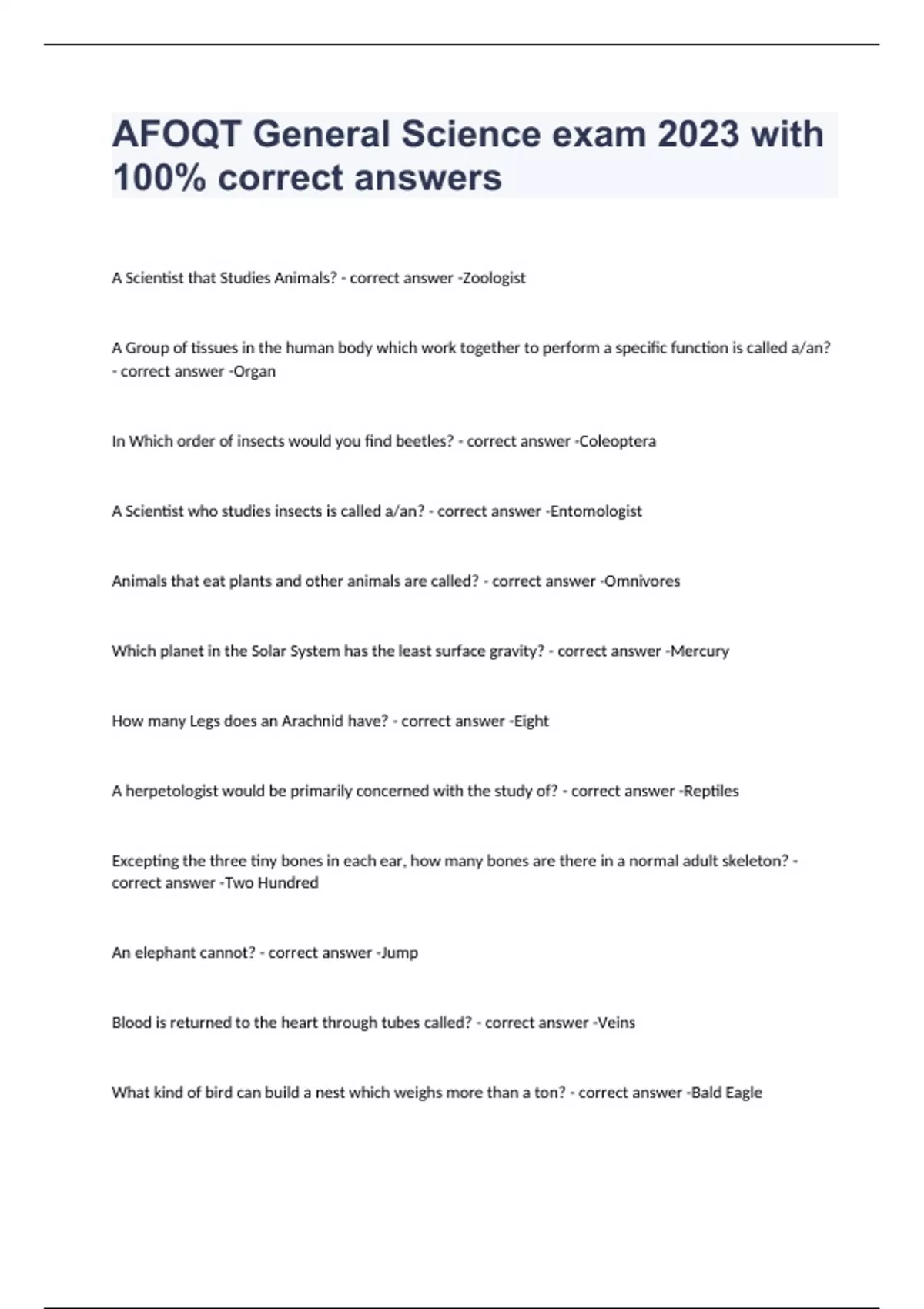 A Scientist that Studies Animals? - correct answer -Zoologist A Group of tissues in the human body which work together to perform a specific function is called a/an? - correct answer -Organ In Which order of insects would you find beetles? - correct answer -Coleoptera A Scientist who studies insects is called a/an? - correct answer -Entomologist Animals that eat plants and other animals are called? - correct answer -Omnivores Which planet in the Solar System has the least surface gravity? - correct answer -Mercury How many Legs does an Arachnid have? - correct answer -Eight A herpetologist would be primarily concerned with the study of? - correct answer -Reptiles Excepting the three tiny bones in each ear, how many bones are there in a normal adult skeleton? - correct answer -Two Hundred An elephant cannot? - correct answer -Jump Blood is returned to the heart through tubes called? - correct answer -Veins What