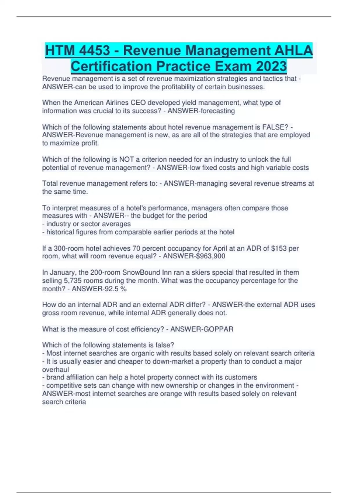 HTM 4453 - Revenue Management AHLA Certification Practice Exam 2023 Revenue management is a set of revenue maximization strategies and tactics that - ANSWER-can be used to improve the profitability of certain businesses. When the American Airlines CEO developed yield management, what type of information was crucial to its success? - ANSWER-forecasting Which of the following statements about hotel revenue management is FALSE? - ANSWER-Revenue management is new, as are all of the strategies that are employed to maximize profit. Which of the following is NOT a criterion needed for an industry to unlock the full potential of revenue management? - ANSWER-low fixed costs and high variable costs Total revenue management refers to: - ANSWER-managing several revenue streams at the same time. To interpret measures of a hotel's performance, managers often compare those measures with - ANSWER-- the budget for the period - industry or sector averages - historical figures from comparable earlier periods at the hotel If a 300-room hotel achieves 70 percent occupancy for April at an ADR of $153 per room, what will room revenue equal? - ANSWER-$963,900 In January, the 200-room SnowBound Inn ran a skiers special that resulted in them selling 5,735 rooms during the month. What was the occupancy percentage for the month? - ANSWER-92.5 % How do an internal ADR and an external ADR differ? - ANSWER-the external ADR uses gross room revenue, while internal ADR generally does not. What is the measure of cost efficiency? - ANSWER-GOPPAR Which of the following statements is false? - Most internet searches are organic with results based solely on relevant search criteria - It is usually easier and cheaper to down-market a property than to conduct a major overhaul - brand affiliation can help a hotel property connect with its customers - competitive sets can change with new ownership or changes in the environment - ANSWER-most internet searches are orange with results based solely on relevant search criteria A given hotel's comp set should contain all other hotels - ANSWER-that compete for the same guests In a 1050-room competitive set, Hotel A has 300 rooms. Hotel B has 350 rooms, and Hotel C has 400 rooms. During a recent 30-day period in which the entire competitive set sold 25,400 rooms, Hotel sold 8,000 rooms. Which of the following statements is indisputably TRUE? - ANSWER-Hotel A exceeded its fair share Which of the following statements about market intelligence is FALSE?...