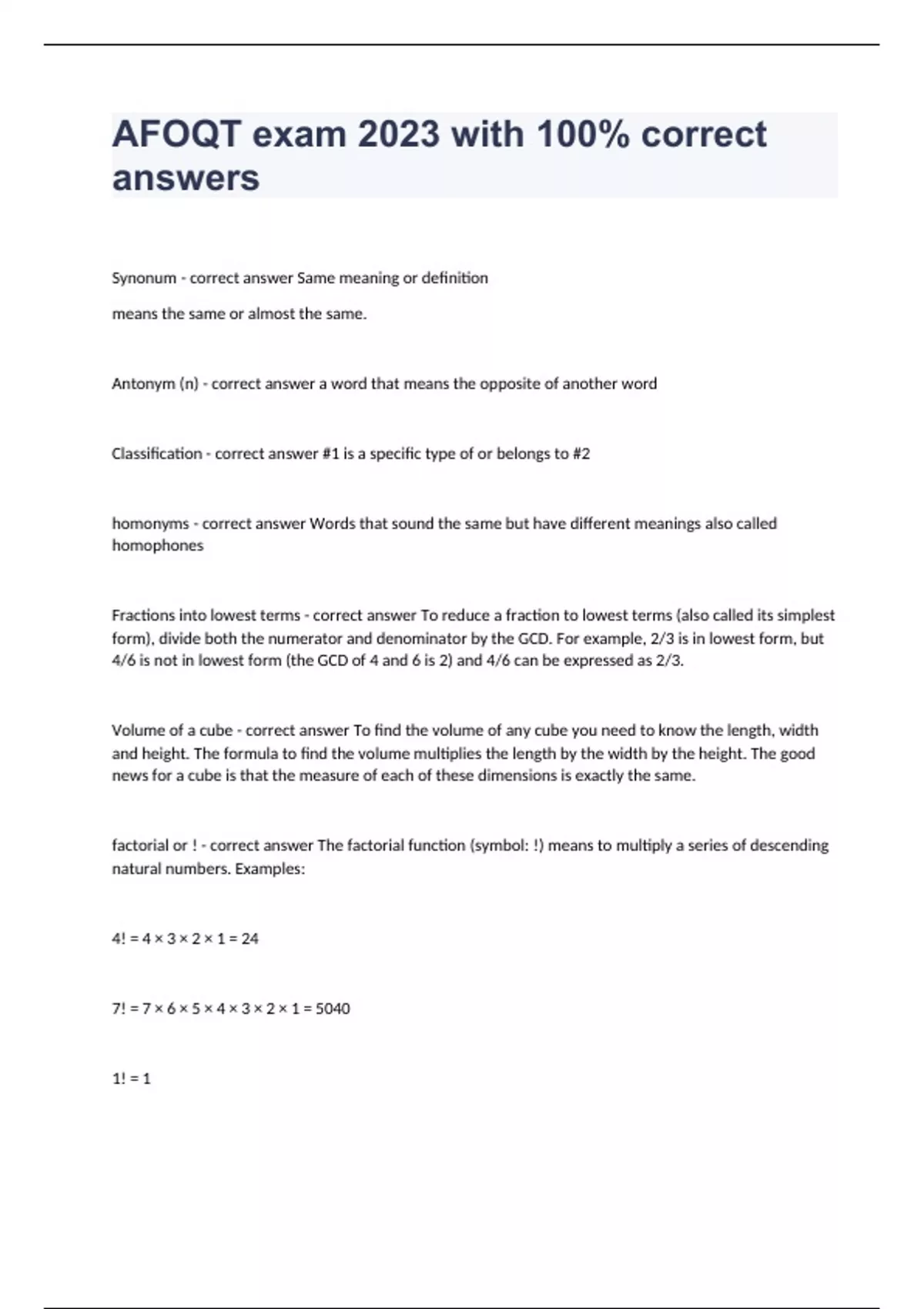 Synonum - correct answer Same meaning or definition means the same or almost the same. Antonym (n) - correct answer a word that means the opposite of another word Classification - correct answer #1 is a specific type of or belongs to #2 homonyms - correct answer Words that sound the same but have different meanings also called homophones Fractions into lowest terms - correct answer To reduce a fraction to lowest terms (also called its simplest form), divide both the numerator and denominator by the GCD. For example, 2/3 is in lowest form, but 4/6 is not in lowest form (the GCD of 4 and 6 is 2) and 4/6 can be expressed as 2/3. Volume of a cube - correct answer To find the volume of any cube you need to know the length, width and height. The formula to find the volume multiplies the length by the width by the height. The good news for a cube is that the measure of each of these dimensions is exactly the same. factorial or ! - correct answer The factorial function (symbol: !) means to multiply a series of descending natural numbers. Examples: 4! = 4 × 3 × 2 × 1 = 24 7! = 7 × 6 × 5 × 4 × 3 × 2 × 1 = 5040