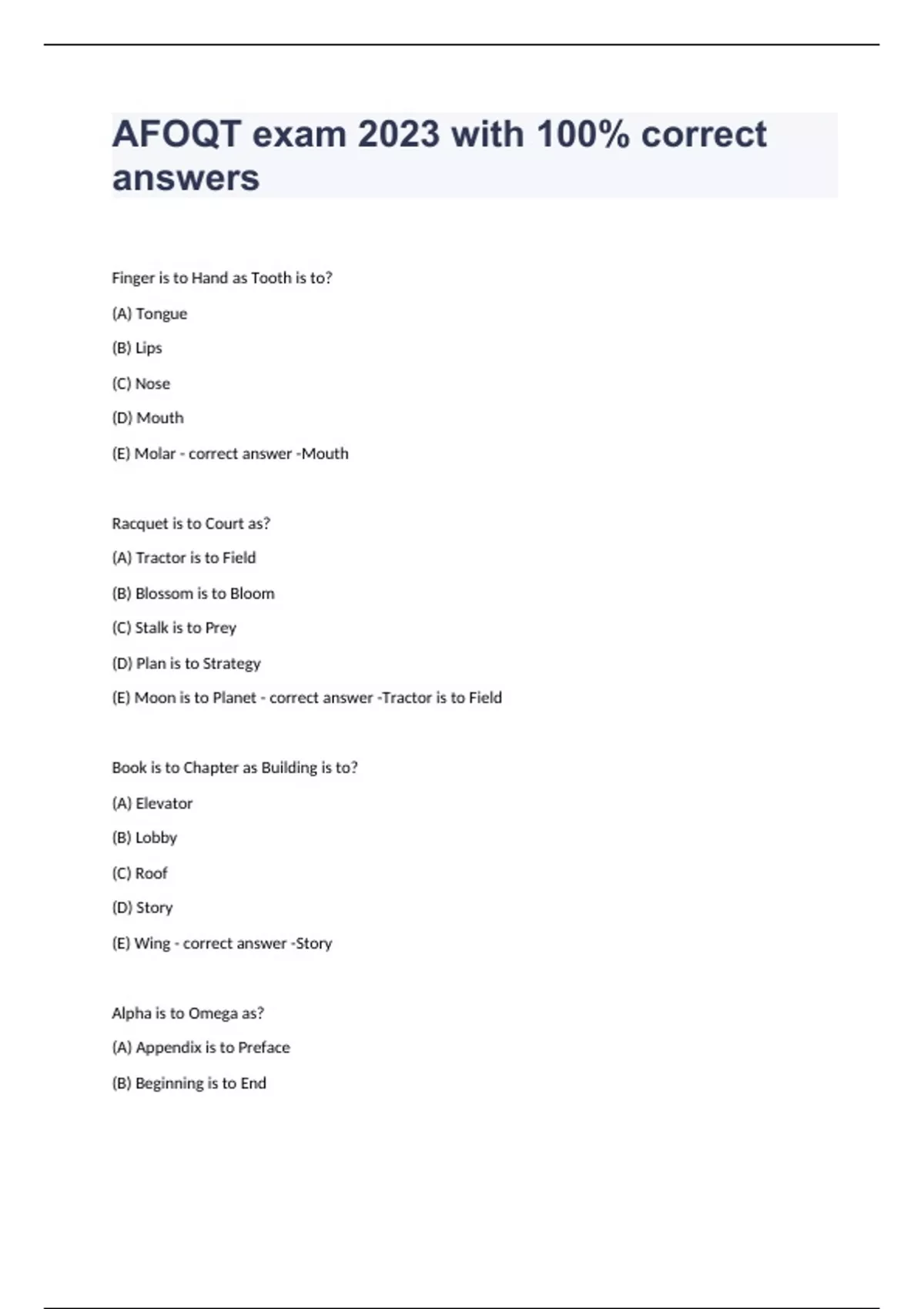 Finger is to Hand as Tooth is to? (A) Tongue (B) Lips (C) Nose (D) Mouth (E) Molar - correct answer -Mouth Racquet is to Court as? (A) Tractor is to Field (B) Blossom is to Bloom (C) Stalk is to Prey (D) Plan is to Strategy (E) Moon is to Planet - correct answer -Tractor is to Field Book is to Chapter as Building is to? (A) Elevator (B) Lobby (C) Roof (D) Story (E) Wing - correct answer -Story Alpha is to Omega as? (A) Appendix is to Preface (B) Beginning is to End (C) Head is to Body (D) Intermission is to Finale (E) Prelude is to Intermission - correct answer -Beginning is to End Carrot is to Vegetable as? (A) Dogwood is to Oak (B) Foot is to Paw (C) Pepper is to Spice (D) Sheep is to Lamb (E) Veal is to Beef - correct answer -Pepper is to Spice Micrometer is to Machinist as Trowel is to? (A) Blacksmith (B) Electrician (C) Mason (D) Pressman (E) Welder