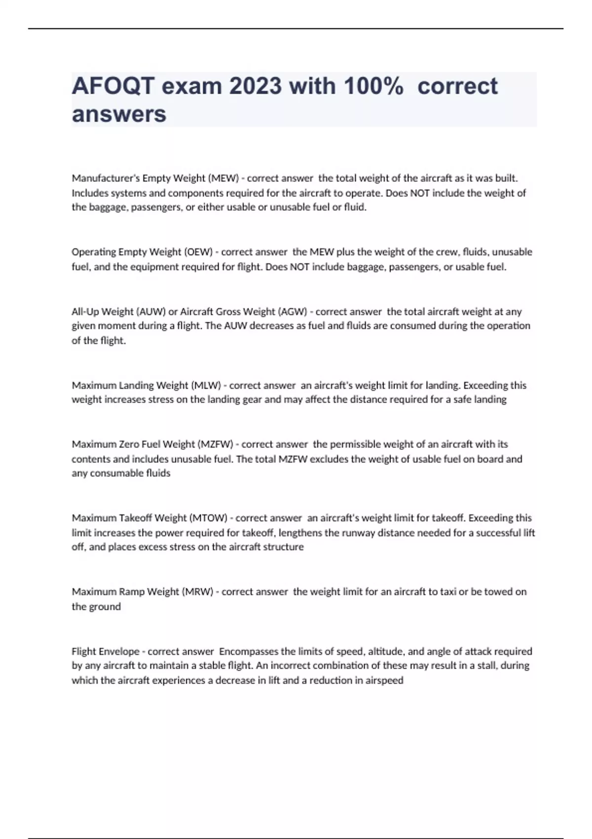 Manufacturer's Empty Weight (MEW) - correct answer the total weight of the aircraft as it was built. Includes systems and components required for the aircraft to operate. Does NOT include the weight of the baggage, passengers, or either usable or unusable fuel or fluid. Operating Empty Weight (OEW) - correct answer the MEW plus the weight of the crew, fluids, unusable fuel, and the equipment required for flight. Does NOT include baggage, passengers, or usable fuel. All-Up Weight (AUW) or Aircraft Gross Weight (AGW) - correct answer the total aircraft weight at any given moment during a flight. The AUW decreases as fuel and fluids are consumed during the operation of the flight. Maximum Landing Weight (MLW) - correct answer an aircraft's weight limit for landing. Exceeding this weight increases stress on the landing gear and may affect the distance required for a safe landing Maximum Zero Fuel Weight (MZFW) - correct answer the permissible weight of an aircraft with its contents and includes unusable fuel. The total MZFW excludes the weight of usable fuel on board and any consumable fluids Maximum Takeoff Weight (MTOW) - correct answer an aircraft's weight limit for takeoff. Exceeding this limit increases the power required for takeoff, lengthens the runway distance needed for a successful lift off, and places excess stress on the aircraft structure Maximum Ramp Weight (MRW) - correct answer the weight limit for an aircraft to taxi or be towed on the ground Flight Envelope - correct answer Encompasses the limits of speed, altitude, and angle of attack required by any aircraft to maintain a stable flight. An incorrect combination of these may result in a stall, during which the aircraft experiences a decrease in lift and a reduction in airspeed Angle of