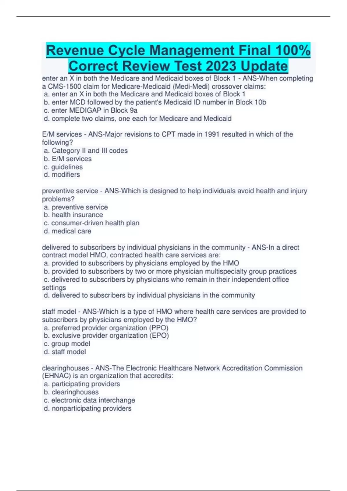 Revenue Cycle Management Final 100% Correct Review Test 2023 Update enter an X in both the Medicare and Medicaid boxes of Block 1 - ANS-When completing a CMS-1500 claim for Medicare-Medicaid (Medi-Medi) crossover claims: a. enter an X in both the Medicare and Medicaid boxes of Block 1 b. enter MCD followed by the patient's Medicaid ID number in Block 10b c. enter MEDIGAP in Block 9a d. complete two claims, one each for Medicare and Medicaid E/M services - ANS-Major revisions to CPT made in 1991 resulted in which of the following? a. Category II and III codes b. E/M services c. guidelines d. modifiers preventive service - ANS-Which is designed to help individuals avoid health and injury problems? a. preventive service b. health insurance c. consumer-driven health plan d. medical care delivered to subscribers by individual physicians in the community - ANS-In a direct contract model HMO, contracted health care services are: a. provided to subscribers by physicians employed by the HMO b. provided to subscribers by two or more physician multispecialty group practices c. delivered to subscribers by physicians who remain in their independent office settings d. delivered to subscribers by individual physicians in the community staff model - ANS-Which is a type of HMO where health care services are provided to subscribers by physicians employed by the HMO? a. preferred provider organization (PPO) b. exclusive provider organization (EPO) c. group model d. staff model clearinghouses - ANS-The Electronic Healthcare Network Accreditation Commission (EHNAC) is an organization that accredits: a. participating providers b. clearinghouses c. electronic data interchange d. nonparticipating providers higher out-of-pocket expenses - ANS-Most preferred provider organizations (PPOs) are open-ended plans that allow patients to use non-PPO providers in exchange for: a. higher out-of-pocket expenses b. lower copayments c. higher premiums d. lower deductibles DRGs - ANS-Which system enacted by TEFRA issues a predetermined payment for inpatient services? a. ICD-9-CM b. CPT c. DRGs d. HCPCS level II capitation - ANS-Health care providers accept pre-established payments for providing care to health plan enrollees over a period of time under the reimbursement method of: a. fee-for-service b. Resource-Based Relative Value Scale (RBRVS) c. capitation d. point-of-service case management - ANS-Development of patient care plans for the coordination and provision of care for complicated cases is a part of: a. utilization review b. preadmission certification c. case management d. discharge planning physician incentive plan - ANS-Which requires managed care plans that contract with Medicare or Medicaid to disclose information about physician incentive plans to CMS or state Medicaid agencies before a new or renewed contract receives final approval? a. physician incentive plan b. federally qualified HMO c. Office of Managed Care d. Amendment to the HMO Act protects information collected by consumer reporting agencies such as credit bureaus, medical information companies, and tenant screening services - ANS-The Fair Credit Reporting Act: a. helps consumers resolve billing issues with card issuers and protects important credit rights b. requires credit and charge card issuers to provide certain disclosures in direct mail, telephone, and other applications and solicitations for open-end credit and charge accounts and under other circumstances c. protects information collected by consumer reporting agencies such as credit bureaus, medical information companies, and tenant screening services d. specifies what a collection source may and may not do when pursuing payment of past due accounts facilitates innovation and competition among Medicare HMOs - ANS-The Office of Managed Care is a CMS agency that: a. contracts with and acquires the clinical and business assets of physician practices b. facilitates innovation and competition among Medicare HMOs c. assesses the quality of managed care plans in the United States and releases the data to the public for its consideration when selecting a managed care plan d. ensures the accountability of managed care plans in terms of objective, measurable standards point-of-service plan (POS) - ANS-Which was implemented to create flexibility in managed care plans, which would allow patients to self-refer to out-of-network providers? a. point-of-service plan (POS) b. preferred provider organization (PPO) c. customized sub-capitation plan (CSCP) d. competitive medical plan (CMP) abstract of all recent claims filed on each patient - ANS-The common data file is a(n): a. chronological summary of all transactions posted to individual patient ledgers/accounts on a specific day b. series of fixed-length records submitted to payers to bill for health care services c. computerized permanent record of all financial transactions between the patient and the practice d. abstract of all recent claims filed on each patient QISMC (quality improvement system for managed care) - ANS-Which was established by Medicare to ensure the accountability of managed care plans in terms of objective, measurable standards? a. QAPI (quality assessment and performance improvement program) b. NCQA (national committee for quality assurance) c. EQRO (external quality review organization) d. QISMC (quality improvement system for managed care) open-panel HMO - ANS-A model in which health care is provided by individuals who are not employees of the HMO or who do not belong to a specially formed medical group that serves the HMO is known as a(n): a. staff model HMO b. closed-panel HMO c. group model HMO d. open-panel HMO Continues...