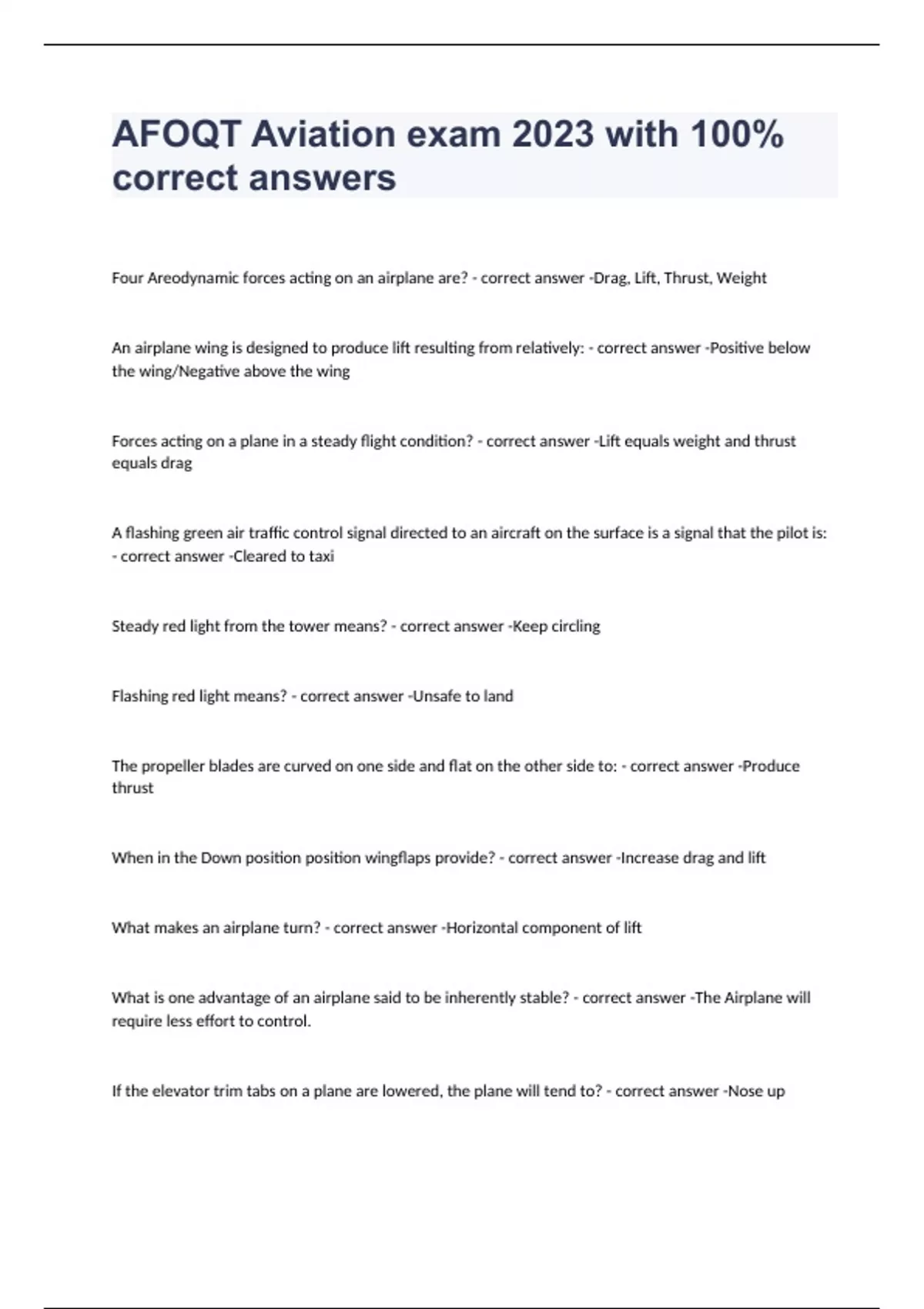 The small hinged section on the elevator of the most airplanes is known as the: - correct answer -Trim Tab At night, airport taxiways are identified by omnidirectional edge lights that are? - correct answer -Blue If the ammeter in an aircraft shows a negative value this means: - correct answer -Output from the alternator or generator output is inadequate The thrust of a turbojet is developed by compressing air in the inlet and compressor, mixing the air with fuel and burning it in the combustor and... - correct answer -Expanding the gas stream through the turbine and nozzle A ramjet engine consists of? - correct answer -Inlet, combustion zone and a nozzle For a fixed wing aircraft, lift is generated _____ to the direction of flight. - correct answer -Perpendicular The angle formed by the chord of an airfoil or wing and the direction of the relative wind is known as the: - correct answer -Angle of attack Pilot tubes furnish data to an instrument that is used by aircraft pilots in about the same way that a ________ is used by and automobile driver. - correct answer -Speedometer The part of the aircraft that holds the cargo, fuel and passengers- as well as providing a base for the other aircraft parts- is known as the: - correct answer -Fuselage On a conventional aircraft the ____ controls pitch and ____ controls Yaw. - correct answer -Horizontal stabilizers and Vertical Stabilizers ______ are additonal hinged rear sections mounted to the wing near the body that are deployed downward on takeoff and landing to increase the amount of force produced by the wing. - correct answer -Flaps What does not affect density altitude? - correct answer -Wind velocity