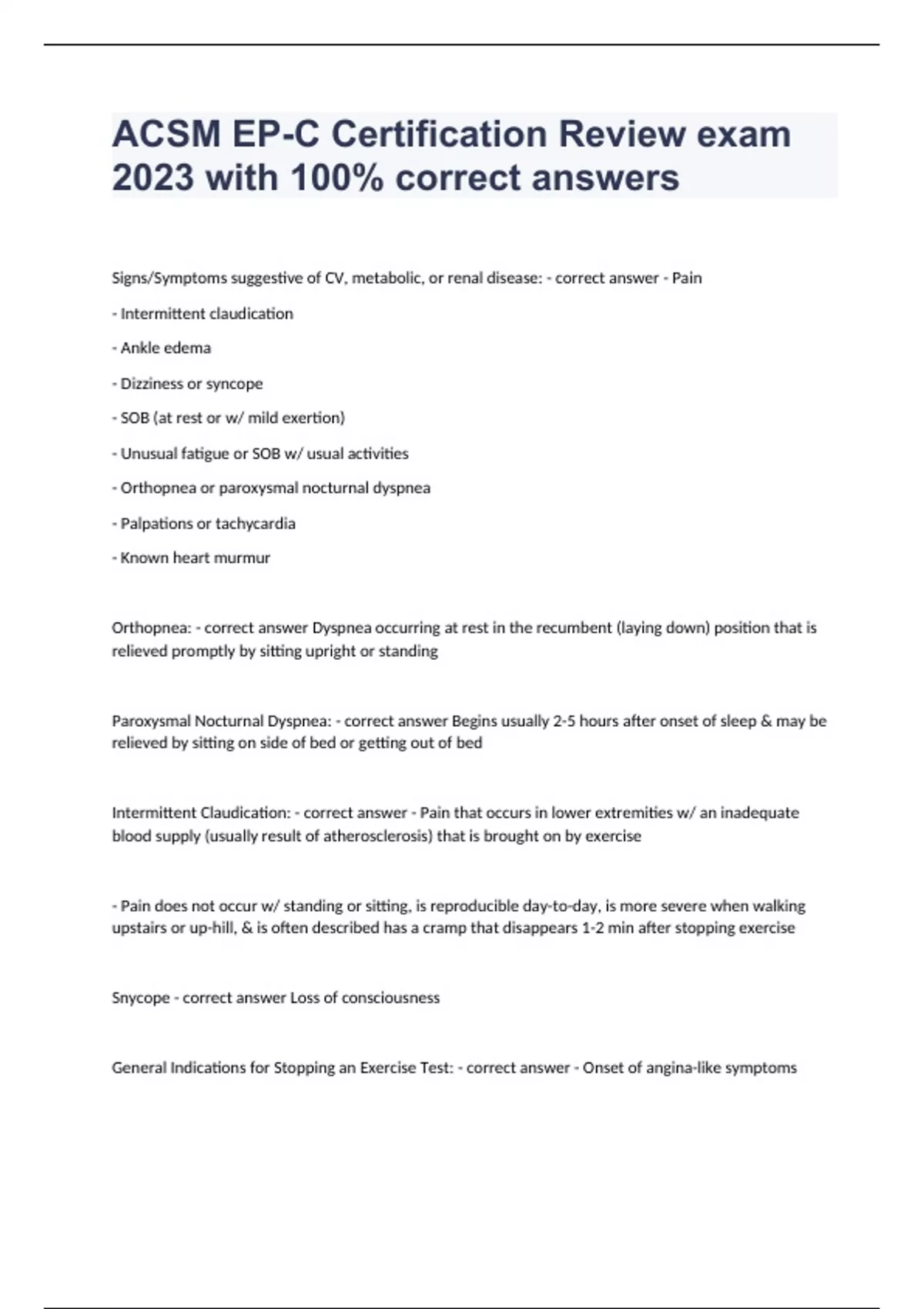 Signs/Symptoms suggestive of CV, metabolic, or renal disease: - correct answer - Pain - Intermittent claudication - Ankle edema - Dizziness or syncope - SOB (at rest or w/ mild exertion) - Unusual fatigue or SOB w/ usual activities - Orthopnea or paroxysmal nocturnal dyspnea - Palpations or tachycardia - Known heart murmur Orthopnea: - correct answer Dyspnea occurring at rest in the recumbent (laying down) position that is relieved promptly by sitting upright or standing Paroxysmal Nocturnal Dyspnea: - correct answer Begins usually 2-5 hours after onset of sleep & may be relieved by sitting on side of bed or getting out of bed Intermittent Claudication: - correct answer - Pain that occurs in lower extremities w/ an inadequate blood supply (usually result of atherosclerosis) that is brought on by exercise - Pain does not occur w/ standing or sitting, is reproducible day-to-day, is more severe when walking upstairs or up-hill, & is often described has a cramp that disappears 1-2 min after stopping exercise Snycope - correct answer Loss of consciousness General Indications for Stopping an Exercise Test: - correct answer - Onset of angina-like symptoms - Drop in SBP >/= 10 w/ an increase in WR or if SBP decreases below value obtained in same position prior to testing - Excessive rise in BP = SBP >/=250 &/or DBP >/= 115 - SOB, wh