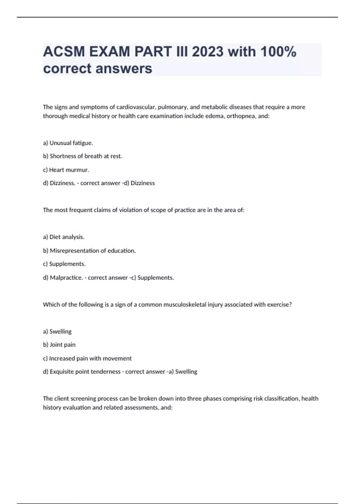 The signs and symptoms of cardiovascular, pulmonary, and metabolic diseases that require a more thorough medical history or health care examination include edema, orthopnea, and: a) Unusual fatigue. b) Shortness of breath at rest. c) Heart murmur. d) Dizziness. - correct answer -d) Dizziness The most frequent claims of violation of scope of practice are in the area of: a) Diet analysis. b) Misrepresentation of education. c) Supplements. d) Malpractice. - correct answer -c) Supplements. Which of the following is a sign of a common musculoskeletal injury associated with exercise? a) Swelling b) Joint pain c) Increased pain with movement d) Exquisite point tenderness - correct answer -a) Swelling The client screening process can be broken down into three phases comprising risk classification, health histo