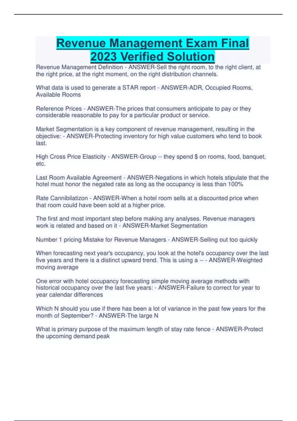 Revenue Management Exam Final 2023 Verified Solution Revenue Management Definition - ANSWER-Sell the right room, to the right client, at the right price, at the right moment, on the right distribution channels. What data is used to generate a STAR report - ANSWER-ADR, Occupied Rooms, Available Rooms Reference Prices - ANSWER-The prices that consumers anticipate to pay or they considerable reasonable to pay for a particular product or service. Market Segmentation is a key component of revenue management, resulting in the objective: - ANSWER-Protecting inventory for high value customers who tend to book last. High Cross Price Elasticity - ANSWER-Group -- they spend $ on rooms, food, banquet, etc. Last Room Available Agreement - ANSWER-Negations in which hotels stipulate that the hotel must honor the negated rate as long as the occupancy is less than 100% Rate Cannibilatizon - ANSWER-When a hotel room sells at a discounted price when that room could have been sold at a higher price. The first and most important step before making any analyses. Revenue managers work is related and based on it - ANSWER-Market Segmentation Number 1 pricing Mistake for Revenue Managers - ANSWER-Selling out too quickly When forecasting next year's occupancy, you look at the hotel's occupancy over the last five years and there is a distinct upward trend. This is using a -- - ANSWER-Weighted moving average One error with hotel occupancy forecasting simple moving average methods with historical occupancy over the last five years: - ANSWER-Failure to correct for year to year calendar differences Which N should you use if there has been a lot of variance in the past few years for the month of September? - ANSWER-The large N What is primary purpose of the maximum length of stay rate fence - ANSWER-Protect the upcoming demand peak Continues...