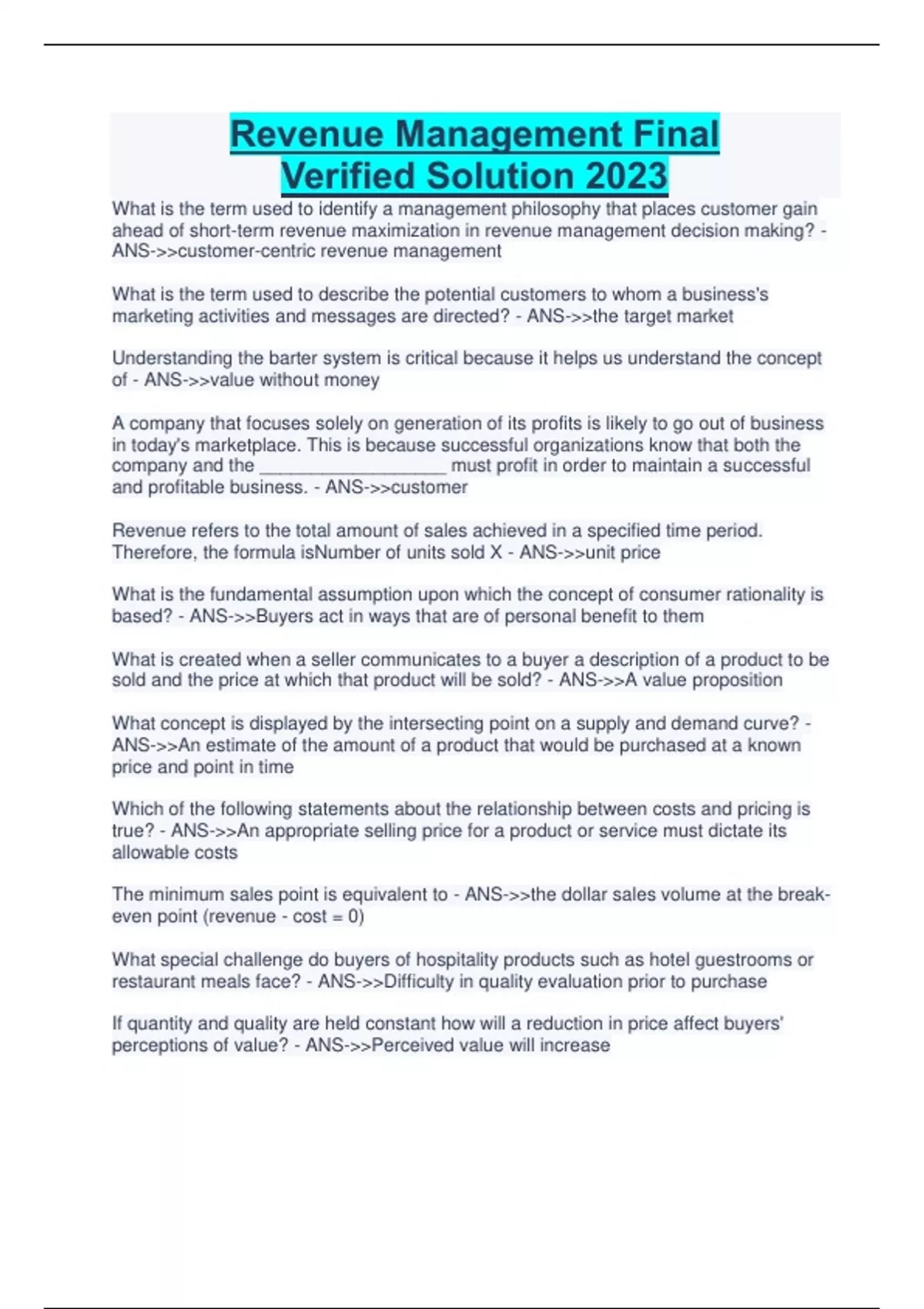 Revenue Management Final Verified Solution 2023 What is the term used to identify a management philosophy that places customer gain ahead of short-term revenue maximization in revenue management decision making? - ANS->>customer-centric revenue management What is the term used to describe the potential customers to whom a business's marketing activities and messages are directed? - ANS->>the target market Understanding the barter system is critical because it helps us understand the concept of - ANS->>value without money A company that focuses solely on generation of its profits is likely to go out of business in today's marketplace. This is because successful organizations know that both the company and the __________________ must profit in order to maintain a successful and profitable business. - ANS->>customer Revenue refers to the total amount of sales achieved in a specified time period. Therefore, the formula isNumber of units sold X - ANS->>unit price What is the fundamental assumption upon which the concept of consumer rationality is based? - ANS->>Buyers act in ways that are of personal benefit to them What is created when a seller communicates to a buyer a description of a product to be sold and the price at which that product will be sold? - ANS->>A value proposition What concept is displayed by the intersecting point on a supply and demand curve? - ANS->>An estimate of the amount of a product that would be purchased at a known price and point in time Which of the following statements about the relationship between costs and pricing is true? - ANS->>An appropriate selling price for a product or service must dictate its allowable costs The minimum sales point is equivalent to - ANS->>the dollar sales volume at the breakeven point (revenue - cost = 0) What special challenge do buyers of hospitality products such as hotel guestrooms or restaurant meals face? - ANS->>Difficulty in quality evaluation prior to purchase If quantity and quality are held constant how will a reduction in price affect buyers' perceptions of value? - ANS->>Perceived value will increase Continues...
