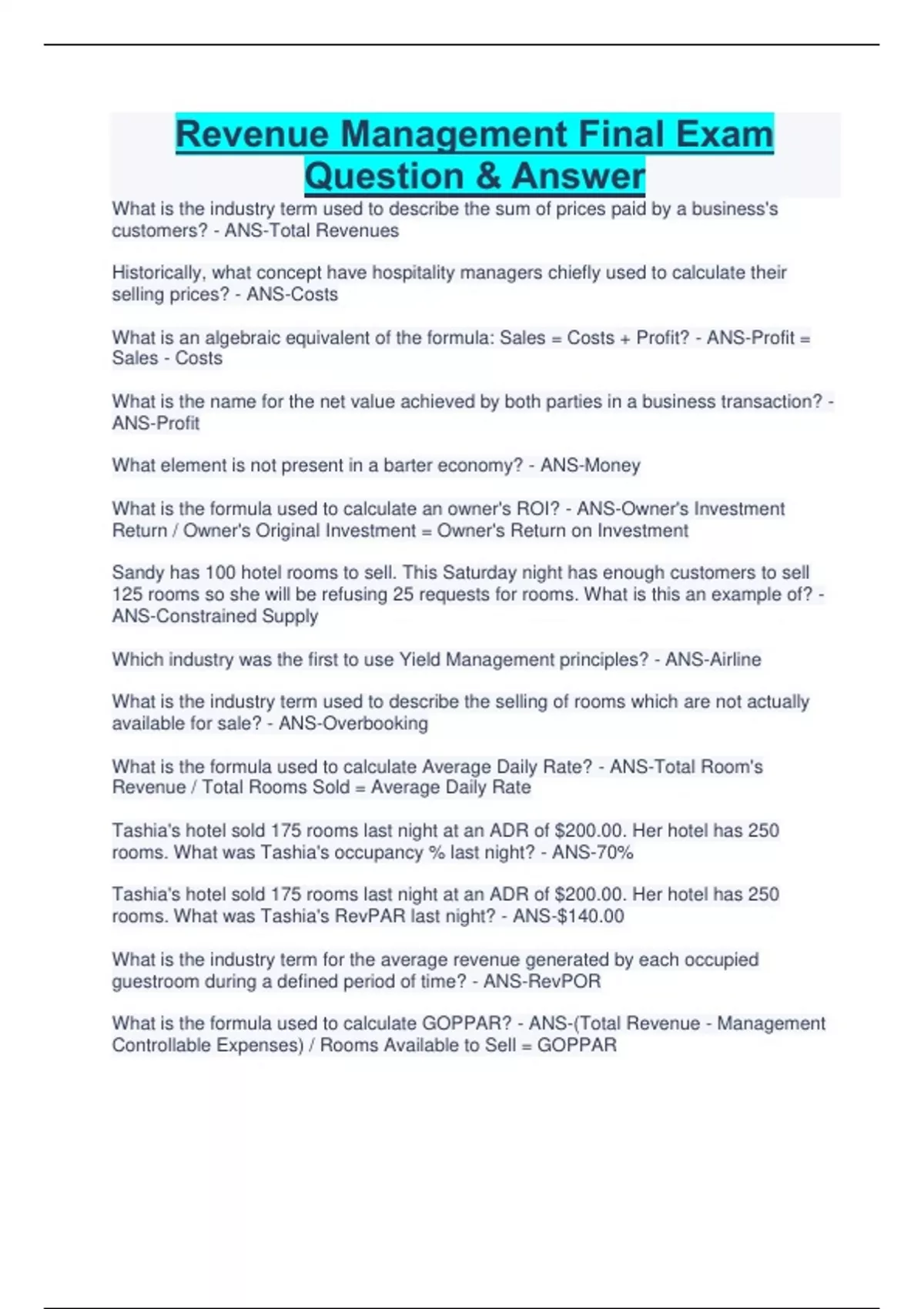 Revenue Management Final Exam Question & Answer What is the industry term used to describe the sum of prices paid by a business's customers? - ANS-Total Revenues Historically, what concept have hospitality managers chiefly used to calculate their selling prices? - ANS-Costs What is an algebraic equivalent of the formula: Sales = Costs + Profit? - ANS-Profit = Sales - Costs What is the name for the net value achieved by both parties in a business transaction? - ANS-Profit What element is not present in a barter economy? - ANS-Money What is the formula used to calculate an owner's ROI? - ANS-Owner's Investment Return / Owner's Original Investment = Owner's Return on Investment Sandy has 100 hotel rooms to sell. This Saturday night has enough customers to sell 125 rooms so she will be refusing 25 requests for rooms. What is this an example of? - ANS-Constrained Supply Which industry was the first to use Yield Management principles? - ANS-Airline What is the industry term used to describe the selling of rooms which are not actually available for sale? - ANS-Overbooking What is the formula used to calculate Average Daily Rate? - ANS-Total Room's Revenue / Total Rooms Sold = Average Daily Rate Tashia's hotel sold 175 rooms last night at an ADR of $200.00. Her hotel has 250 rooms. What was Tashia's occupancy % last night? - ANS-70% Tashia's hotel sold 175 rooms last night at an ADR of $200.00. Her hotel has 250 rooms. What was Tashia's RevPAR last night? - ANS-$140.00 What is the industry term for the average revenue generated by each occupied guestroom during a defined period of time? - ANS-RevPOR What is the formula used to calculate GOPPAR? - ANS-(Total Revenue - Management Controllable Expenses) / Rooms Available to Sell = GOPPAR What is the industry term for a customer group which can be readily identified by one or more common characteristics? - ANS-Market Segment What is rack rate? - A