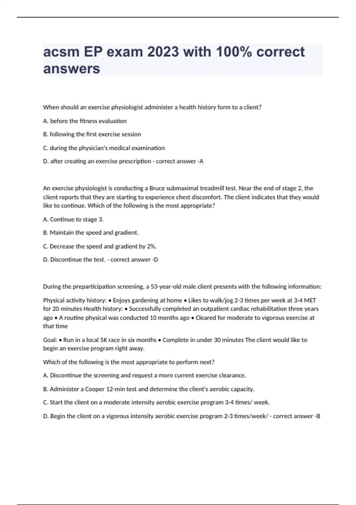 When should an exercise physiologist administer a health history form to a client? A. before the fitness evaluation B. following the first exercise session C. during the physician's medical examination D. after creating an exercise prescription - correct answer -A An exercise physiologist is conducting a Bruce submaximal treadmill test. Near the end of stage 2, the client reports that they are starting to experience chest discomfort. The client indicates that they would like to continue. Which of the following is the most appropriate? A. Continue to stage 3. B. Maintain the speed and gradient. C. Decrease the speed and gradient by 2%. D. Discontinue the test. - correct answer -D During the preparticipation screening, a 53-year-old male client presents with the following information: Physical activity history: • Enjoys gardening at home • Likes to walk/jog 2-3 times per week at 3-4 MET for 20 minutes Health history: • Successfully completed an outpatient cardiac rehabilitation three years ago • A routine physical was conducted 10 months ago • Cleared for moderate to vigorous exercise at that time Goal: • Run in a local 5K race in six months • Complete in under 30 minutes The client would like to begin an exercise program right away. Which of the following is the most appropriate to perform next? A. Discontinue the screening and request a more current exercise clearance. B. Administer a Cooper 12-min test and determine the client's aerobic capacity. C. Start th
