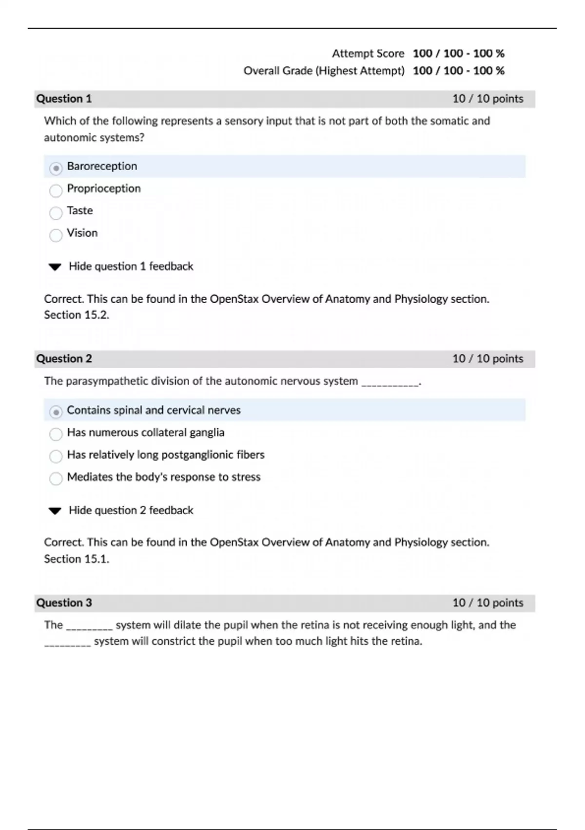 1. Which of the following represents a sensory input that is not part of both the somatic and autonomic systems? 2. The parasympathetic division of the autonomic nervous system _________. 3. The _____________ system will dilate the pupil when the retina is not receiving enough light, and the ________ system will constrict the pupil when too much light hits the retina. 4. Which of the following can be the cause of orthostatic hypotension? 5. Regarding the sympathetic division of the autonomic nervous system, which of these is TRUE? 6. Which of the following chemicals can stimulate the parasympathetic nervous system? 7. A drug is called an antagonist if it ____________. 8. A drug that affects both divisions of the autonomic system is going to bind to, or block, which type of neurotransmitter receptor? 9. The neurochemistry of the sympathetic nervous system is based on the adrenergic system. Which of the following neurotransmitters affect(s) the sympathetic nervous system to most? 10. Which type of drug would be an antidote to atropine poisoning?