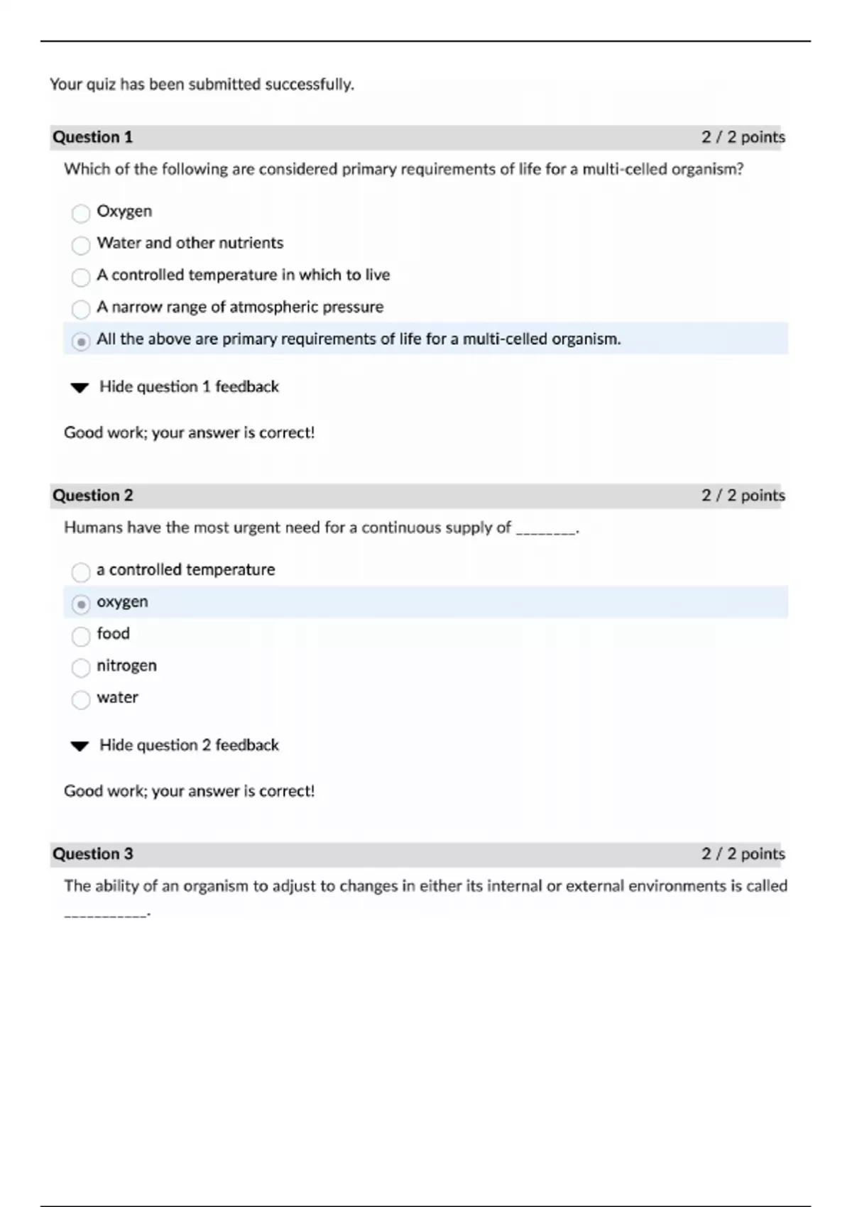 1. Question: Which of the following are considered primary requirements of life for a multi-celled organism? 2. Question: Humans have the most urgent need for a continuous supply of ________ 3. Question: The ability of an organism to adjust to changes in either its internal or external environments is called __________. 4. Question: Every cell in an animal is separated from other cells and from the extracellular environment by a cell (plasma) membrane. Which of the following are found inside the cell membrane? 5. Question: Physiology... 6. Question: Which of the following statements is/are true? 7. Question: The cervical region of the vertebral column consists of _______. 8. Question: The adult vertebral column does not form a straight line, but instead has four curvatures along its length. These curves _______ 9. Question: The vertebral column is also known as the __________. 10. Question: The thoracic cage protects the ________. 11. Question: True ribs are _________. 12. Question: Which organ system is responsible for producing sex hormones and producing milk for an infant? 13. Question: This is the physiological value around which the normal range fluctuates? 14. Question: The study of the structures that work together to perform a unique body function is called what? 15. Question: What is human physiology? 16. Question: Which function of human life deals with the ability of an organism to adjust to changes in its internal and external environments? 17. Question: Which organ system is responsible for processing food used by the body and removing waste from undigested food? 18. Question: A group of many similar cells that work together to perform a specific function is referred to as this level of organization. 19. Question: What is the metabolic process by which larger, more complex substances are broken down into smaller, simpler molecules? 20. Question: How many "functions" of human life are there? 21. Question: This directional term describes the back or towards the back of the body. 22. Question: In the anatomical position, the body is standing upright, with the feet at shoulder width and parallel, toes forward, arms by the side, and how are the palms facing? 23. Question: This directional term describes a position farther from the surface of the body. 24. Question: Which medical imaging technique are best used to visualize hard body structures such as teeth and bones? 25. Question: Which medical imaging technique uses computers to combine several cross-sectional X-rays in order to reveal details about the structures? 26. Question: A typical vertebrae has which of these? 27. Question: Which of the following is a bone of the brain case? 28. Question: Which of the following does the sphenoid bone include? 29. Question: Which of the following curves of the spine are considered to be a "primary curve?" 30. Question: Which bone of the skull is NOT considered a bone of the brain case? 31. Question: Which of the following is a dissacharide? 32. Question: During a party, Eli loses a bet and is forced to drink a bottle of lemon juice. Not long thereafter, he begins complaining of having difficulty breathing, and his friends take him to the local emergency room. His blood pH is 7.28. What does this mean? 33. Question: CH4 is methane and what type of compound? 34. Question: Nitrogen has an atomic number of seven. How many electron shells does it likely have? 35. Question: A saturated fatty acid has the maximum number of which atoms in its chain? 36. Question: An atom can have from one to five electron shells. Each shell can hold up to 8 electrons except for which shell? 37. Question: All proteins are made of repeating units of ___________. 38. Question: The characteristic that gives an element its distinctive properties is its number of what? 39. Question: Which of the following is NOT a part of the nucleotides that make up DNA? 40. Question: Which of these is not one of the fundamental chemical reactions? 41. Question: When an atom donates an electron to another atom, it becomes what? 42. Question: Cholesterol is what type of molecule? 43. Question: Together, just four elements make up more than 95 percent of the body's mass. Which ones are they? 44. Question: Which of the following types of substances dissolve in water? 45. Question: Which of the following do all amino acids have in common? 46. Question: What are organic compounds, such as carbohydrates, lipids, proteins, and nucleic acids, within the human body often referred to as? 47. Question: Most of the chemical reactions in the body are facilitated by which of the following? 48. Question: Inorganic compounds typically do not contain which atoms? 49. Question: Jenny mixes up a batch of pancake batter, then stirs in some chocolate chips. As she is waiting for the first few pancakes to cook, she notices the chocolate chips sinking to the bottom of the clear glass mixing bowl. What is the chocolate chip batter an example of? 50. Question: A substance formed of crystals of equal numbers of cations and anions held together by ionic bonds is called what?