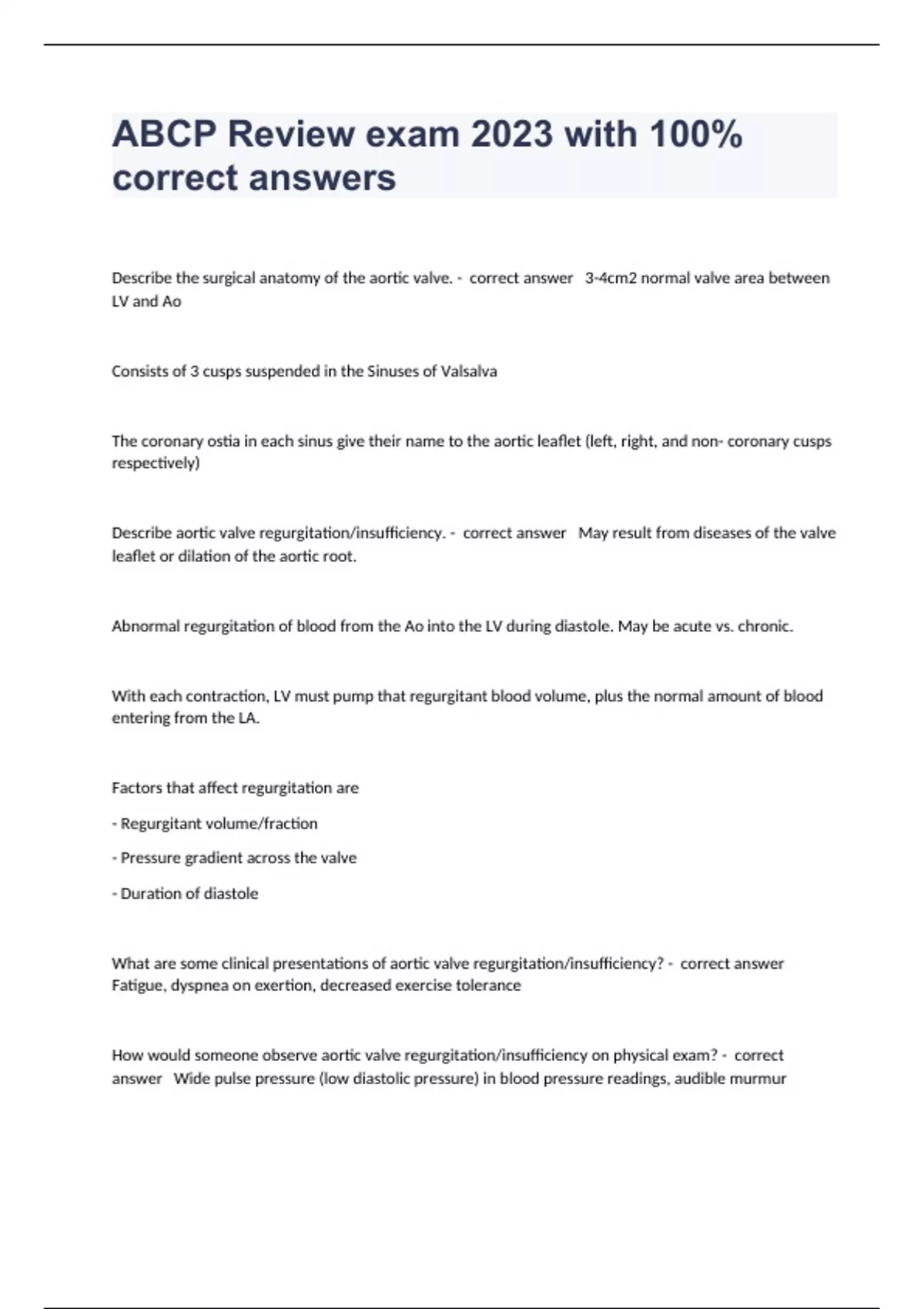 Describe the surgical anatomy of the aortic valve. - correct answer 3-4cm2 normal valve area between LV and Ao Consists of 3 cusps suspended in the Sinuses of Valsalva The coronary ostia in each sinus give their name to the aortic leaflet (left, right, and non- coronary cusps respectively) Describe aortic valve regurgitation/insufficiency. - correct answer May result from diseases of the valve leaflet or dilation of the aortic root. Abnormal regurgitation of blood from the Ao into the LV during diastole. May be acute vs. chronic. With each contraction, LV must pump that regurgitant blood volume, plus the normal amount of blood entering from the LA. Factors that affect regurgitation are - Regurgitant volume/fraction - Pressure gradient across the valve - Duration of diastole What are some clinical presentations of aortic valve regurgitation/insufficiency? - correct answer Fatigue, dyspnea on exertion, decreased exercise tolerance How would someone observe aortic valve regurgitation/insufficiency on physical exam? - correct answer Wide pulse pressure (low diastolic pressure) in blood pressure readings, audible murmur