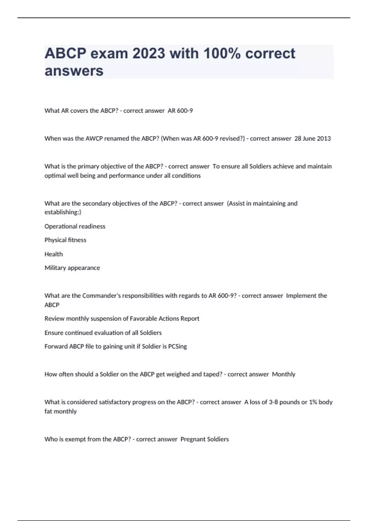 What AR covers the ABCP? - correct answer AR 600-9 When was the AWCP renamed the ABCP? (When was AR 600-9 revised?) - correct answer 28 June 2013 What is the primary objective of the ABCP? - correct answer To ensure all Soldiers achieve and maintain optimal well being and performance under all conditions What are the secondary objectives of the ABCP? - correct answer (Assist in maintaining and establishing:) Operational readiness Physical