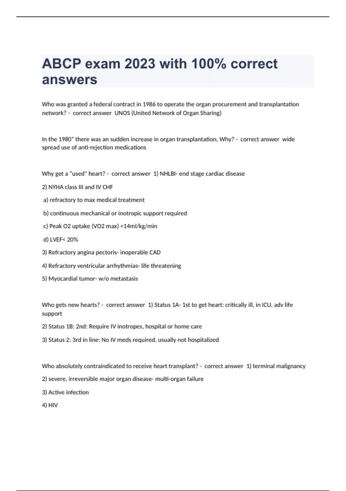 Who was granted a federal contract in 1986 to operate the organ procurement and transplantation network? - correct answer UNOS (United Network of Organ Sharing) In the 1980" there was an sudden increase in organ transplantation, Why? - correct answer wide spread use of anti-rejection medications Why get a "used" heart? - correct answer 1) NHLBI- end stage cardiac disease 2) NYHA class III and IV CHF a) refractory to max medical treatment b) continuous mechanical or inotropic support required c) Peak O2 uptake (VO2 max) <14ml/kg/min d) LVEF< 20% 3) Refractory angina pectoris- inoperable CAD 4) Refractory ventricular arrhythmias- life threatening 5) Myocardial tumor- w/o metastasis