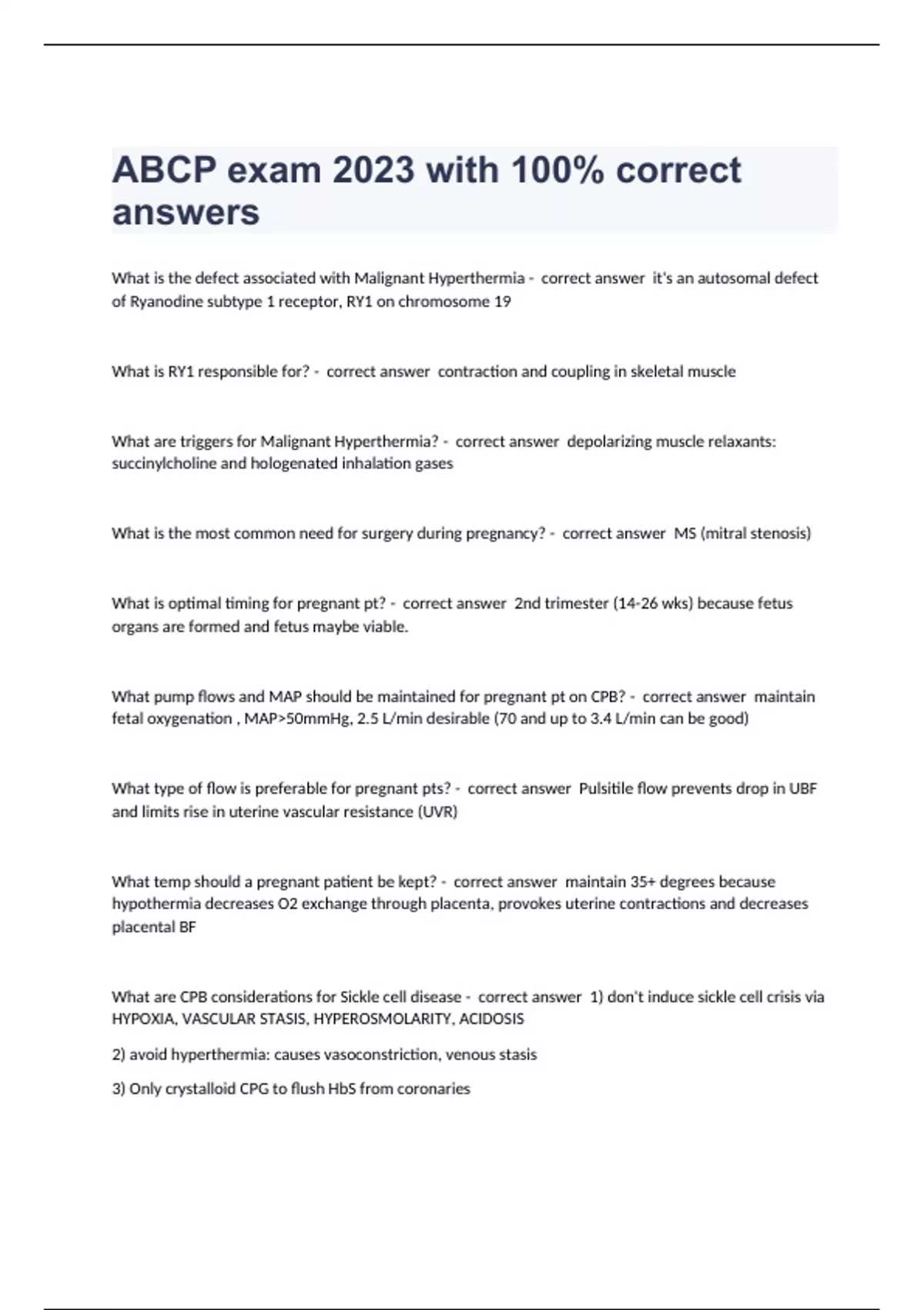 What is the defect associated with Malignant Hyperthermia - correct answer it's an autosomal defect of Ryanodine subtype 1 receptor, RY1 on chromosome 19 What is RY1 responsible for? - correct answer contraction and coupling in skeletal muscle What are triggers for Malignant Hyperthermia? - correct answer depolarizing muscle relaxants: succinylcholine and hologenated inhalation gases What is the most common need for surgery during pregnancy? - correct answer MS (mitral stenosis) What is optimal timing for pregnant pt? - correct answer 2nd trimester (14-26 wks) because fetus organs are formed and fetus maybe viable. What pump flows and MAP should be maintained for pregnant pt on CPB? - correct answer maintain fetal oxygenation , MAP>50mmHg, 2.5 L/min desirable (70 and up to 3.4 L/min can be good) What type of flow is preferable for pregnant pts? - correct answer Pulsitile flow prevents drop in UBF and limits rise in uterine vascular resistance (UVR) What temp should a pregnant patient be kept? - correct answer maintain 35+ degrees because hypothermia decreases O2 exchange through placenta, provokes uterine contractions and decreases placental BF What are CPB considerations for Sickle cell disease - correct answer 1) don't induce sickle cell crisis via HYPOXIA, VASCULAR STASIS, HYPEROSMOLARITY, ACIDOSIS 2) avoid hyperthermia: causes vasoconstriction, venous stasis 3) Only crystalloid CPG to flush HbS from coronaries What are