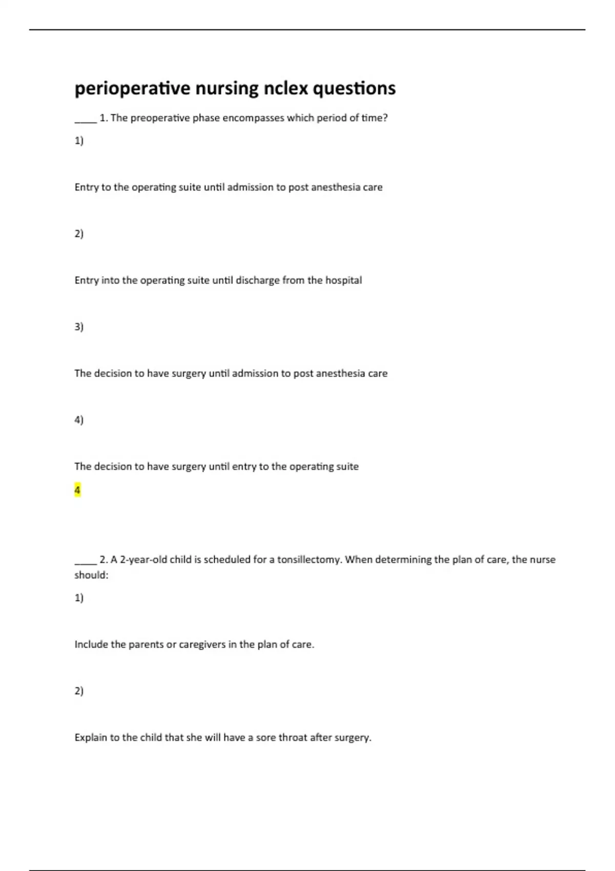 ____ 1. The preoperative phase encompasses which period of time? 1) Entry to the operating suite until admission to post anesthesia care 2) Entry into the operating suite until discharge from the hospital 3) The decision to have surgery until admission to post anesthesia care 4) The decision to have surgery until entry to the operating suite 4 ____ 2. A 2-year-old child is scheduled for a tonsillectomy. When determining the plan of care, the nurse should: 1) Include the parents or caregivers in the plan of care. 2) Explain to the child that she will have a sore throat after surgery