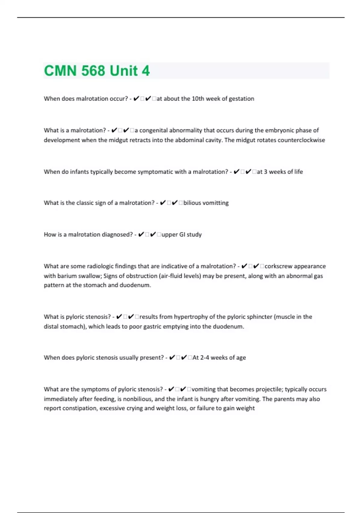 When does malrotation occur? - ️️at about the 10th week of gestation What is a malrotation? - ️️a congenital abnormality that occurs during the embryonic phase of development when the midgut retracts into the abdominal cavity. The midgut rotates counterclockwise When do infants typically become symptomatic with a malrotation? - ️️at 3 weeks of life What is the classic sign of a malrotation? - ️️bilious vomitting How is a malrotation diagnosed? - ️️upper GI study What are some radiologic findings that are indicative of a malrotation? - ️️corkscrew appearance with barium swallow; Signs of obstruction (air-fluid levels) may be present, along with an abnormal gas pattern at the stomach and duodenum. What is pyloric stenosis? - ️️results from hypertrophy of the pyloric sphincter (muscle in the distal stomach), which leads to poor gastric emptying into the duodenum. When does pyloric stenosis usually present? - ️️At 2-4 weeks of age What are the symptoms of pyloric stenosis? - ️️vomiting that becomes projectile; typically occurs immediately after feeding, is nonbilious, and the infant is hungry after vomiting. The parents may also report constipation, excessive crying and weight loss, or failure to gain weight