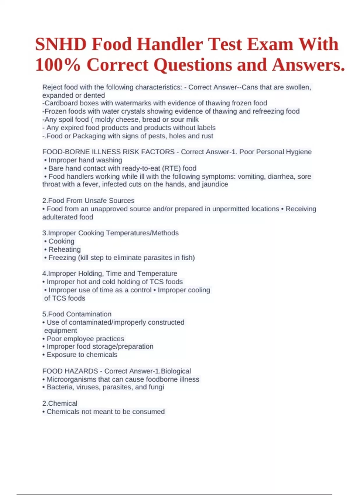 SNHD Food Handler Test Exam With 100% Correct Questions and Answers. Reject food with the following characteristics: - Correct Answer--Cans that are swollen, expanded or dented -Cardboard boxes with watermarks with evidence of thawing frozen food -Frozen foods with water crystals showing evidence of thawing and refreezing food -Any spoil food ( moldy cheese, bread or sour milk - Any expired food products and products without labels -.Food or Packaging with signs of pests, holes and rust FOOD-BORNE ILLNESS RISK FACTORS - Correct Answer-1. Poor Personal Hygiene • Improper hand washing • Bare hand contact with ready-to-eat (RTE) food • Food handlers working while ill with the following symptoms: vomiting, diarrhea, sore throat with a fever, infected cuts on the hands, and jaundice 2.Food From Unsafe Sources • Food from an unapproved source and/or prepared in unpermitted locations • Receiving adulterated food 3.Improper Cooking Temperatures/Methods • Cooking • Reheating • Freezing (kill step to eliminate parasites in fish) 4.Improper Holding, Time and Temperature • Improper hot and cold holding of TCS foods • Improper use of time as a control • Improper cooling of TCS foods 5.Food Contamination • Use of contaminated/improperly constructed equipment • Poor employee practices • Improper food storage/preparation • Exposure to chemicals FOOD HAZARDS - Correct Answer-1.Biological • Microorganisms that can cause foodborne illness • Bacteria, viruses, parasites, and fungi.