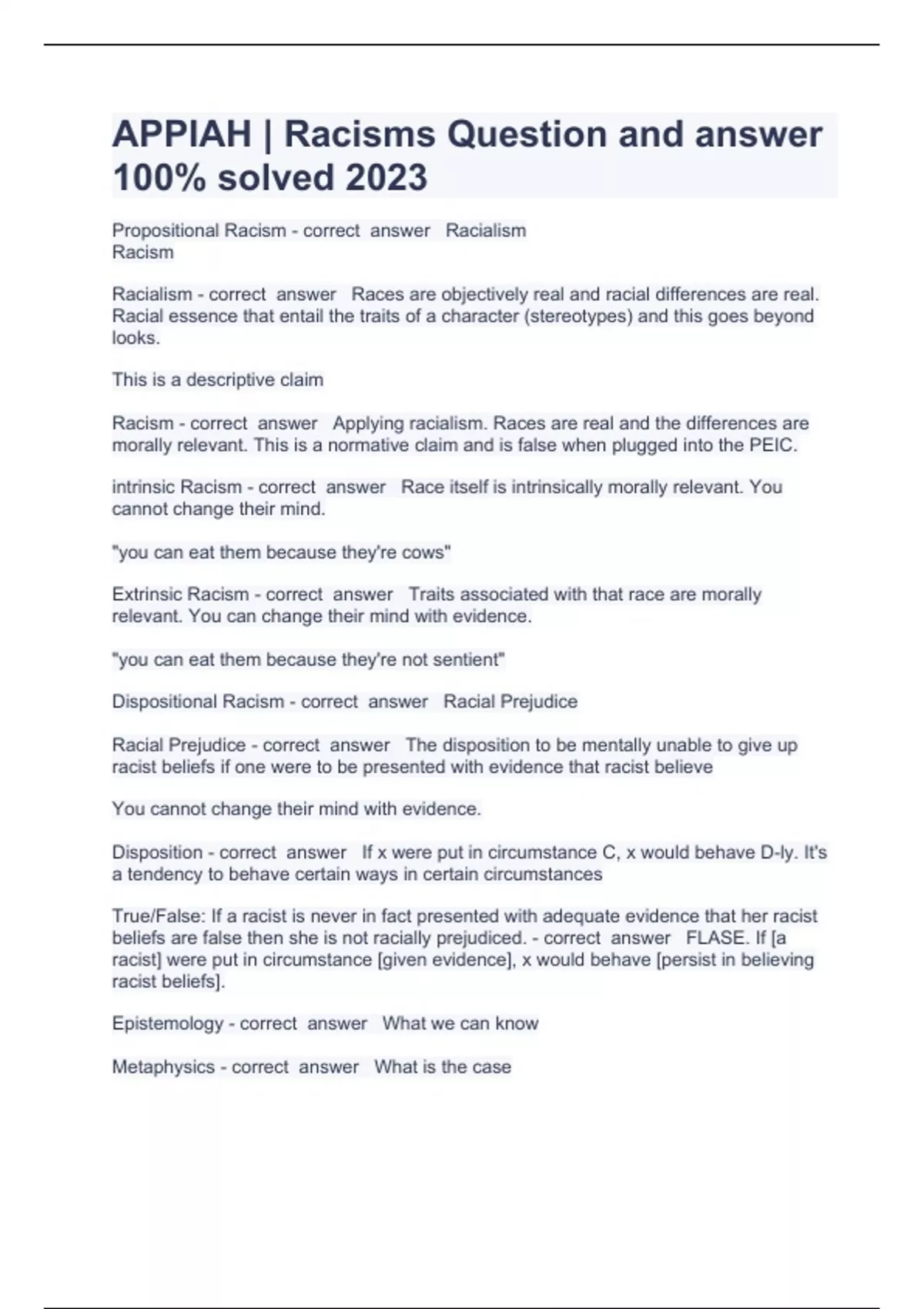APPIAH Questions with complete solution 2023Propositional Racism - correct answer Racialism Racism Racialism - correct answer Races are objectively real and racial differences are real. Racial essence that entail the traits of a character (stereotypes) and this goes beyond looks. This is a descriptive claim Racism - correct answer Applying racialism. Races are real and the differences are morally relevant. This is a normative claim and is false when plugged into the PEIC. intrinsic Racism - correct answer Race itself is intrinsically morally relevant. You cannot change their mind. "you can eat them because they're cows"
