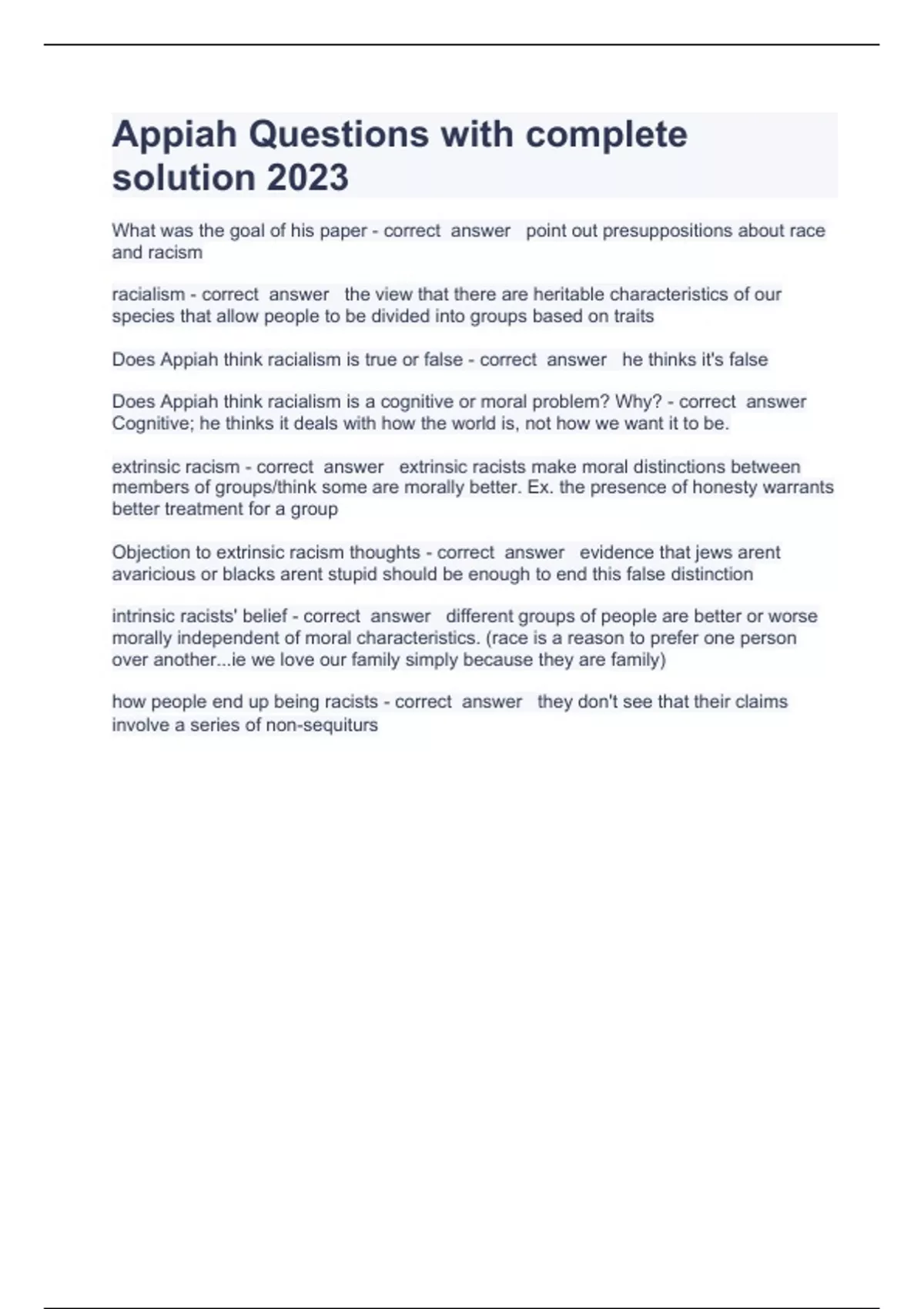 Appiah Questions with complete solution 2023 What was the goal of his paper - correct answer point out presuppositions about race and racism racialism - correct answer the view that there are heritable characteristics of our species that allow people to be divided into groups based on traits Does Appiah think racialism is true or false - correct answer he thinks it's false Does Appiah think racialism is a cognitive or moral problem? Why? - correct answer Cognitive; he thinks it deals with how the world is, not how we want it to be. extrinsic racism - correct answer extrinsic racists make moral distinctions between members of groups/think some are morally better. Ex. the presence of honesty warrants better treatment for a group Objection to extrinsic racism thoughts - correct answer evidence that jews arent avaricious or blacks arent stupid should be enough to end this false distinction