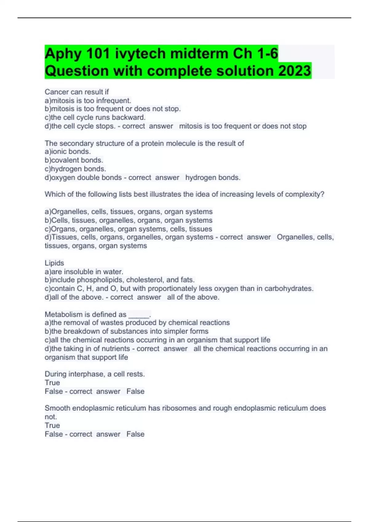 Aphy 101 ivytech midterm Ch 1 Cancer can result if a)mitosis is too infrequent. b)mitosis is too frequent or does not stop. c)the cell cycle runs backward. d)the cell cycle stops. - correct answer mitosis is too frequent or does not stop The secondary structure of a protein molecule is the result of a)ionic bonds. b)covalent bonds. c)hydrogen bonds. d)oxygen double bonds - correct answer hydrogen bonds. Which of the following lists best illustrates the idea of increasing levels of complexity? a)Organelles, cells, tissues, organs, organ systems b)Cells, tissues, organelles, organs, organ systems c)Organs, organelles, organ systems, cells, tissues d)Tissues, cells, organs, organelles, organ systems - correct answer Organelles, cells, tissues, organs, organ syste Questions with complete solution 2023