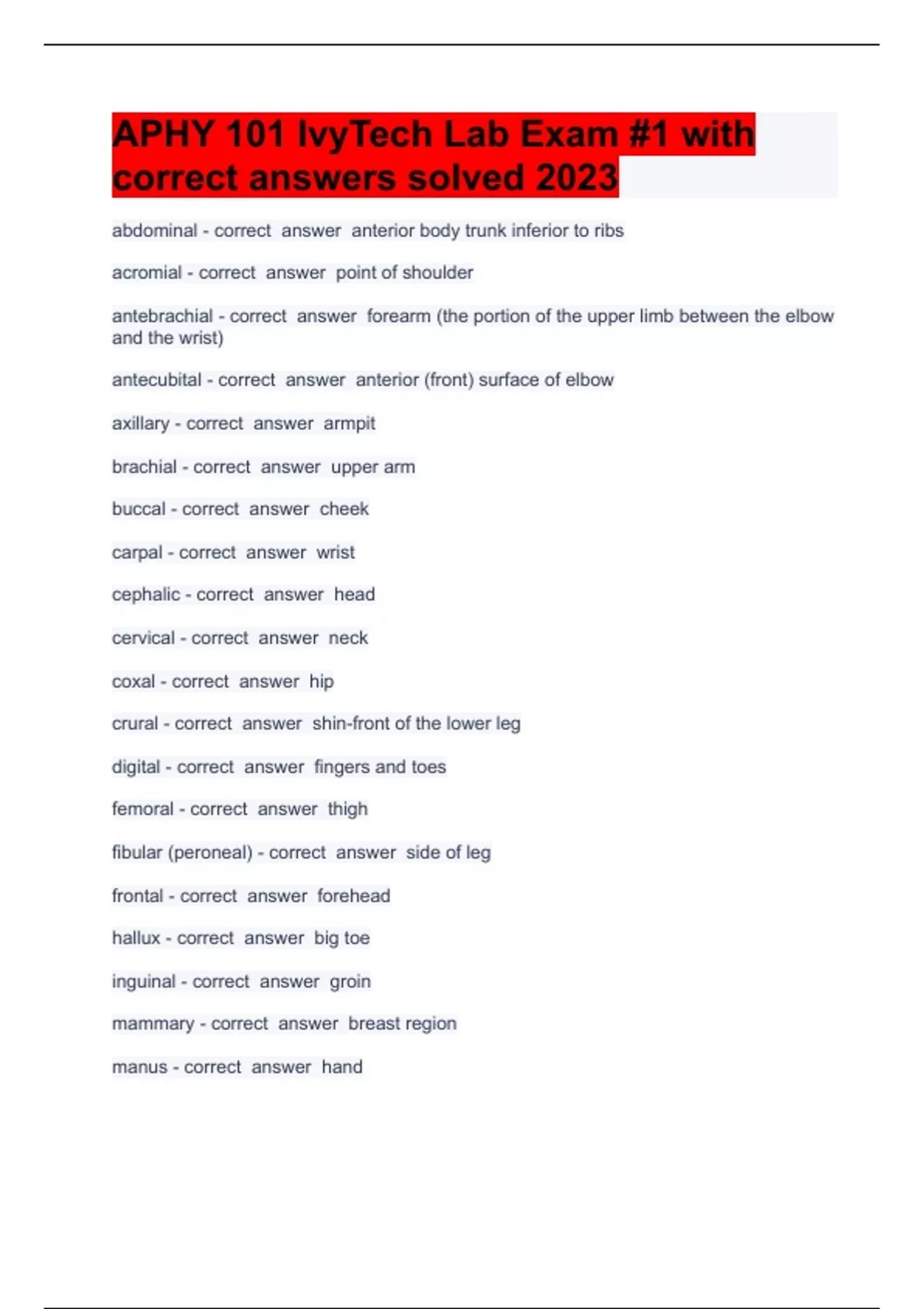 APHY 101 IvyTech Lab Exam Question anabdominal - correct answer anterior body trunk inferior to ribs acromial - correct answer point of shoulder antebrachial - correct answer forearm (the portion of the upper limb between the elbow and the wrist) antecubital - correct answer anterior (front) surface of elbow axillary - correct answer armpit brachial - correct answer upper arm buccal - correct answer cheek carpal - correct answer wrist cephalic - correct answer head cervical - correct answer neck coxal - correct answer hip crural - correct answer shin-front of the lower leg digital - correct answer fingers and toes femoral - correct answer thigh fibular (peroneal) - correct answer side of leg frontal - correct answer forehead d answers rated A+ 2023
