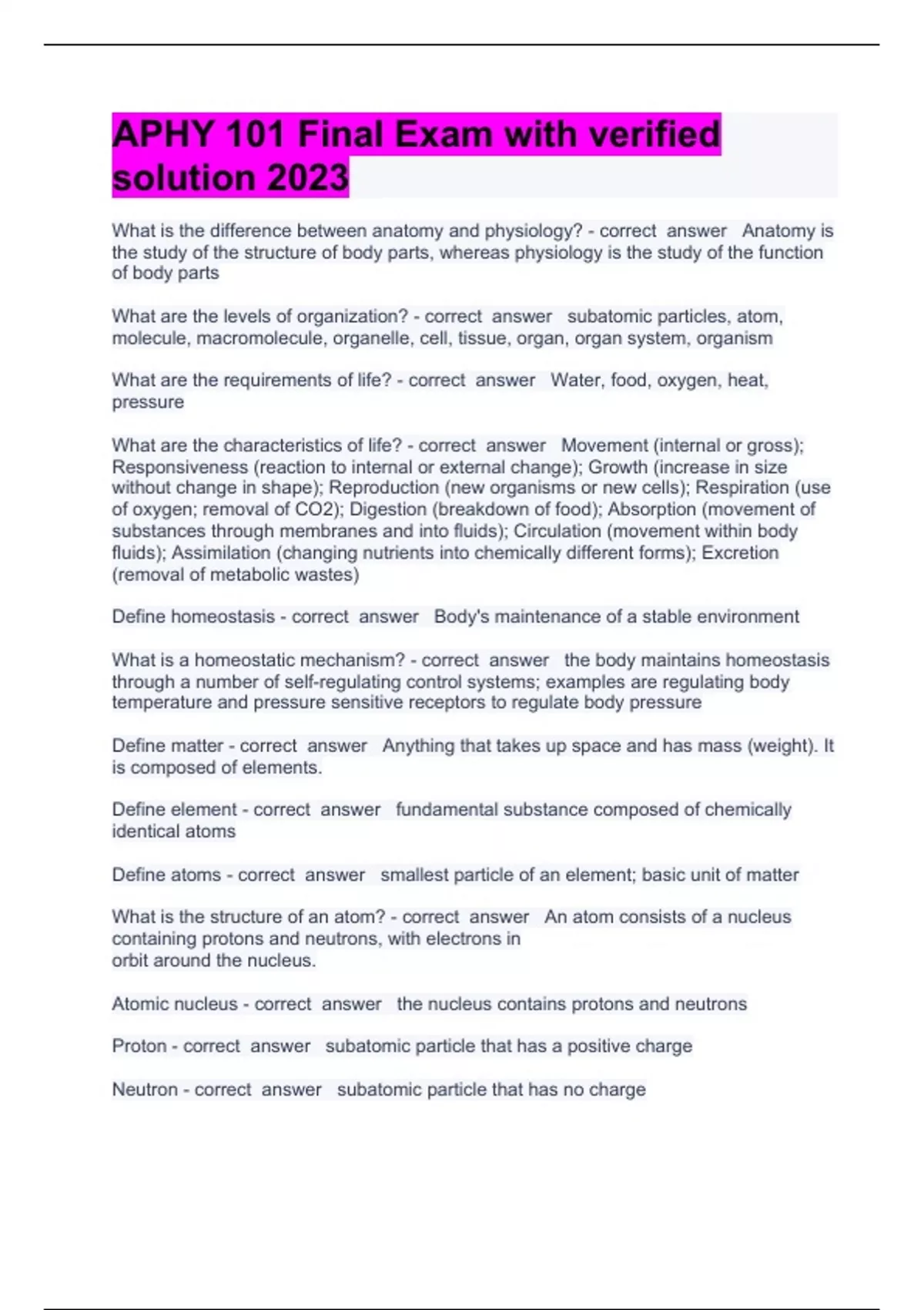 APHY 101 Final Exam with verified solution 202What is the difference between anatomy and physiology? - correct answer Anatomy is the study of the structure of body parts, whereas physiology is the study of the function of body parts What are the levels of organization? - correct answer subatomic particles, atom, molecule, macromolecule, organelle, cell, tissue, organ, organ system, organism What are the requirements of life? - correct answer Water, food, oxygen, heat, pressure What are the characteristics of life? - correct answer Movement (internal or gross); Responsiveness (reaction to internal or external change); Growth (increase in size without change in shape); Reproduction (new organisms or new cells); Respiration (use of oxygen; removal of CO2); Digestion (breakdown of food); Absorption (movement of substances through membranes and into fluids); Circulation (movement within body fluids); Assimilation (changing nutrients into chemically different forms); Excretion (removal of metabolic wastes) Define homeostasis - correct answer Body's maintenance of a stable environment What is a homeostatic mechanism? - correct answer the body maintains homeostasis through a number of self-regulating control systems; examples are regulating body temperature and pressure sensitive receptors to regulate body pressure Define matter - correct answer Anything that takes up space and has mass (weight). It is composed of elements. Define element - correct answer fundamental substance composed of chemically identical atoms 3