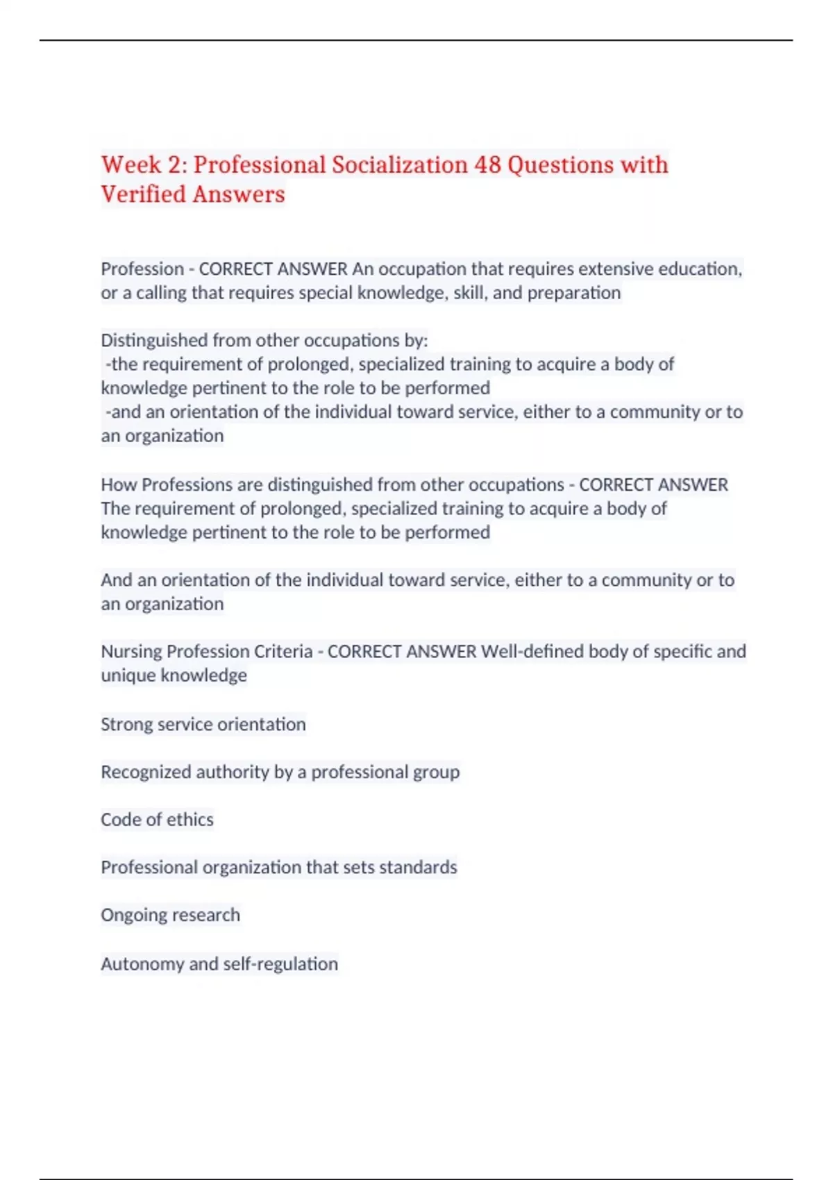 Week 2: Professional Socialization 48 Questions with Verified Answers Profession - CORRECT ANSWER An occupation that requires extensive education, or a calling that requires special knowledge, skill, and preparation Distinguished from other occupations by: -the requirement of prolonged, specialized training to acquire a body of knowledge pertinent to the role to be performed -and an orientation of the individual toward service, either to a community or to an organization How Professions are distinguished from other occupations - CORRECT ANSWER The requirement of prolonged, specialized training to acquire a body of knowledge pertinent to the role to be performed And an orientation of the individual toward service, either to a community or to an organization Nursing Profession Criteria - CORRECT ANSWER Well-defined body of specific and unique knowledge Strong service orientation Recognized authority by a professional group Code of ethics Professional organization that sets standards Ongoing research Autonomy and self-regulation Professionalism - CORRECT ANSWER Refers to a set of attributes or way of life that implies responsibility and commitment This is seen through ways of actions and socialization Professional actions - CORRECT ANSWER Include showing respect for others at all times, acting with integrity, demonstrating professional character and spirit This builds a form of professionalism Professionalization or Professional Socialization - CORRECT ANSWER Acquiring characteristics and learning the ways of the "professional" group in order to become a functioning participant "the process of becoming a professional" includes moving from novice to expert This builds a form of professionalism As a novice nurse, you have entry level knowledge & skills but as you gain experience overtime, you become an expert Professional behavior - CORRECT ANSWER Often developed through belonging to, supporting, and participating in nursing organizations How can a nurse learn what it takes to be a professional and become involved? - CORRECT ANSWER Through Professional Organizations Professional Nursing Organizations Examples - CORRECT ANSWER American Nurses Association (ANA) National League for Nursing (NLN) International Council of Nurses (ICN) Sigma Theta Tau International Honor Society National Student Nurses Association (NSNA) And other Specialty Nursing Organizations Professional Organization - CORRECT ANSWER An (__) of practitioners who judge one another as professionally competent and who have banded together to perform social functions which they cannot perform in their separate capacities as individuals. Nursing (__) must perform the following functions for the preservation and development of the profession Nursing Organizations must perform these for the preservation & development of the profession - CORRECT ANSWER 1) Define & regulate the profession through setting and enforcing standards of education and practice for the generalist and the specialist 2) Develop the knowledge base for practice in its broadest and narrowest components 3) Transmit values, norms, knowledge, and skill to new members of the profession/specialization 4) Communicate & advocate the values and contributions of the field to several publics and constituencies (i.e. participate actively in formulating health legislation & policy) 5) Attend to the social and general welfare of their members. (Professional organizations give social and moral support to members to perform their roles as professionals and to cope with professional problems and their association journals disseminate updated knowledge, new ideas, and professional concerns) American Nurses Association (ANA) - CORRECT ANSWER Founded as the Nurses Associated Alumnae of the U.S. and Canada in 1896; became this in 1911 Purpose: foster high standards of practice, promote a safe and ethical work environment, bolster the health and wellness of nurses, and advocate on health care issues that affect nurses and the public. Journal: American Nurse Today; The Online Journal of Issues in Nursing (OJIN) Can become member through state nurses association National League for Nursing (NLN) - CORRECT ANSWER Organization of both individuals and agencies -includes nurse and non-nurse members Purpose: to foster the development and improvement of all nursing services and nursing education Services: Nursing Schools - helps set educational standards & providing accreditation of nursing programs based on their ability to meet these standards Individuals - providing the ability to continue their education programs & providing scholarships to assist w/ educational aid Journal: Nursing Education Perspectives International Council of Nurses (ICN) - CORRECT ANSWER Established in 1899, it is a federation of national nurses' associations, representing nurses in more that 120 countries. Purpose to ensure: -quality nursing care for all -sound health policies globally -the advancement of nursing knowledge -the presence worldwide of a respected nursing profession and a competent and satisfied nursing workforce Objectives: -To improve the standards and status of nursing -To promote the development of strong national nurses' associations -To serve as the authoritative voice for nurses and the nursing profession worldwide. This Code for Nurses is the foundation for ethical nursing practice throughout the world Journal = International Nursing Review Sigma Theta Tau International Honor Society - CORRECT ANSWER Founded in 1922 ... greek letters stand for "love, courage, and honor" Membership = students in baccalaureate programs in nursing and nurses in master's, doctoral, and postdoctoral programs are eligible to be selected for membership. Focus = scholarship and nursing research to guide practice Mission: provide leadership and scholarship in nursing practice, education, and research to enhance the health of all people Became incorporated in 1985 as "(__)l, Inc." to support and connect the global communit