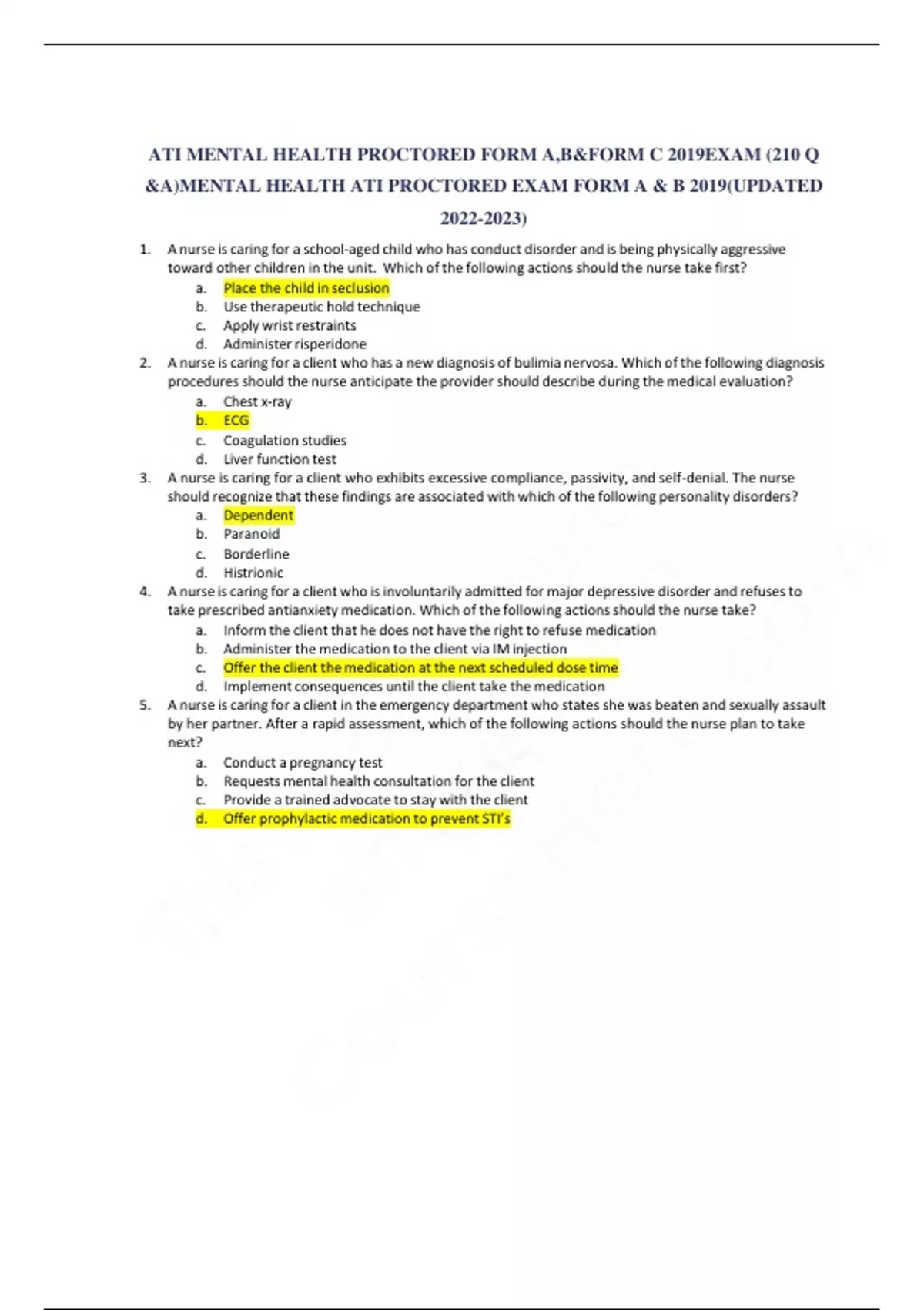 ATI MENTAL HEALTH PROCTORED FORM A,B&FORM C 2019EXAM (210 Q &A)MENTAL HEALTH ATI PROCTORED EXAM FORM A & B 2019(UPDATED ) 1. A nurse is caring for a school-aged child who has conduct disorder and is being physically aggressive toward other children in the unit. Which of the following actions should the nurse take first? a. Place the child in seclusion b. Use therapeutic hold technique c. Apply wrist restraints d. Administer risperidone 2. A nurse is caring for a client who has a new diagnosis of bulimia nervosa. Which of the following diagnosis procedures should the nurse anticipate the provider should describe during the medical evaluation? a. Chest x-ray b. ECG c. Coagulation studies d. Liver function test 3. A nurse is caring for a client who exhibits excessive compliance, passivity, and self-denial. The nurse should recognize that these findings are associated with which of the following personality disorders? a. Dependent b. Paranoid c. Borderline d. Histrionic 4. A nurse is caring for a client who isinvoluntarily admitted for major depressive disorder and refusesto take prescribed antianxiety medication. Which of the following actions should the nurse take? a. Inform the client that he does not have the right to refuse medication b. Administer the medication to the client via IM injection c. Offer the client the medication at the next scheduled dose time d. Implement consequences until the client take the medication 5. A nurse is caring for a client in the emergency department who states she was beaten and sexually assault by her partner. After a rapid assessment, which of the following actions should the nurse plan to take next? a. Conduct a pregnancy test b. Requests mental health consultation for the client c. Provide a trained advocate to stay with the client d. Offer prophylactic medication to prevent STI’s