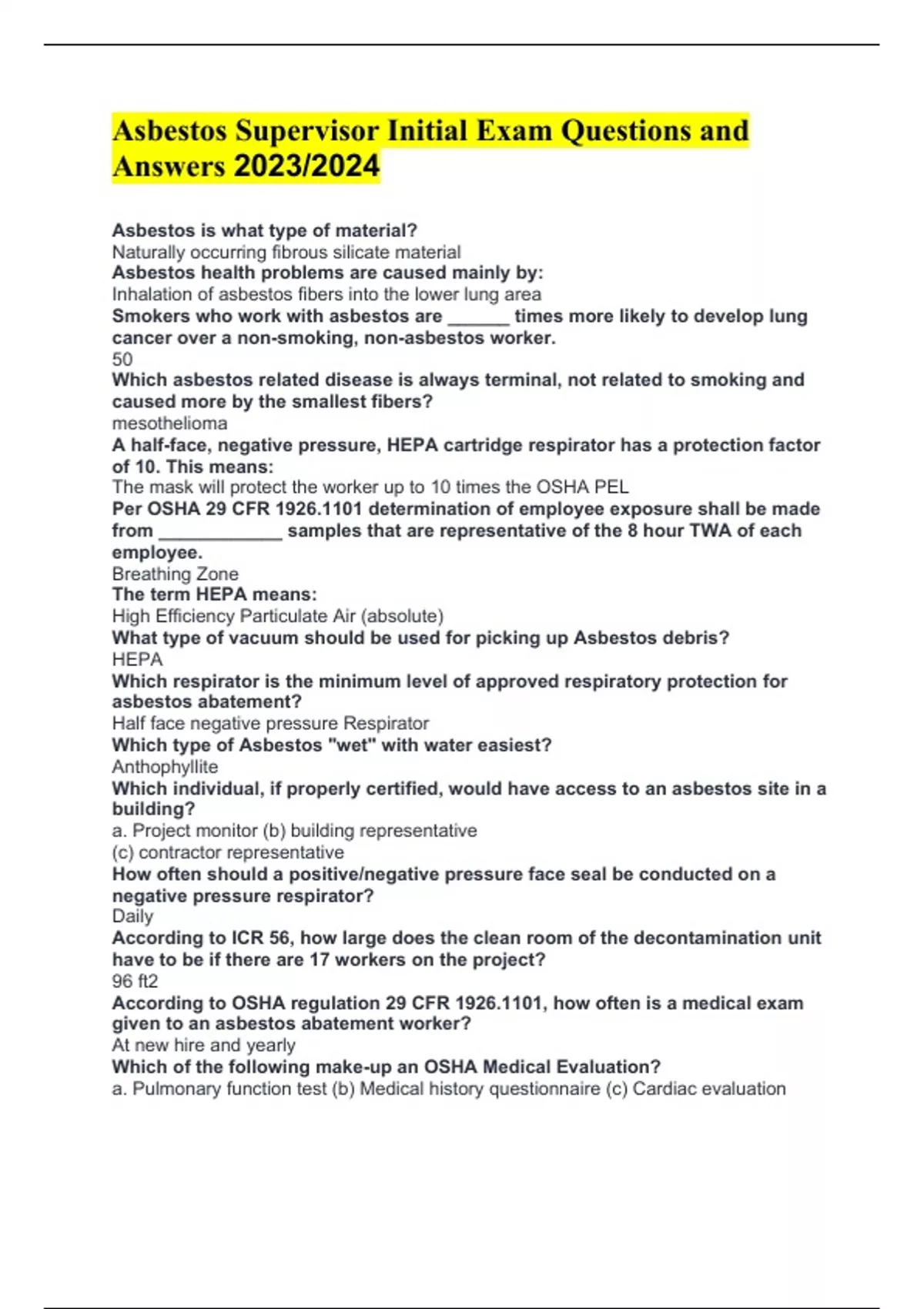 Asbestos Supervisor Initial Exam Questions and Answers 2023/2024 Asbestos is what type of material? Naturally occurring fibrous silicate material Asbestos health problems are caused mainly by: Inhalation of asbestos fibers into the lower lung area Smokers who work with asbestos are ______ times more likely to develop lung cancer over a non-smoking, non-asbestos worker. 50 Which asbestos related disease is always terminal, not related to smoking and caused more by the smallest fibers? mesothelioma A half-face, negative pressure, HEPA cartridge respirator has a protection factor of 10. This means: The mask will protect the worker up to 10 times the OSHA PEL Per OSHA 29 CFR 1926.1101 determination of employee exposure shall be made from ____________ samples that are representative of the 8 hour TWA of each employee. Breathing Zone The term HEPA means: High Efficiency Particulate Air (absolute) What type of vacuum should be used for picking up Asbestos debris? HEPA