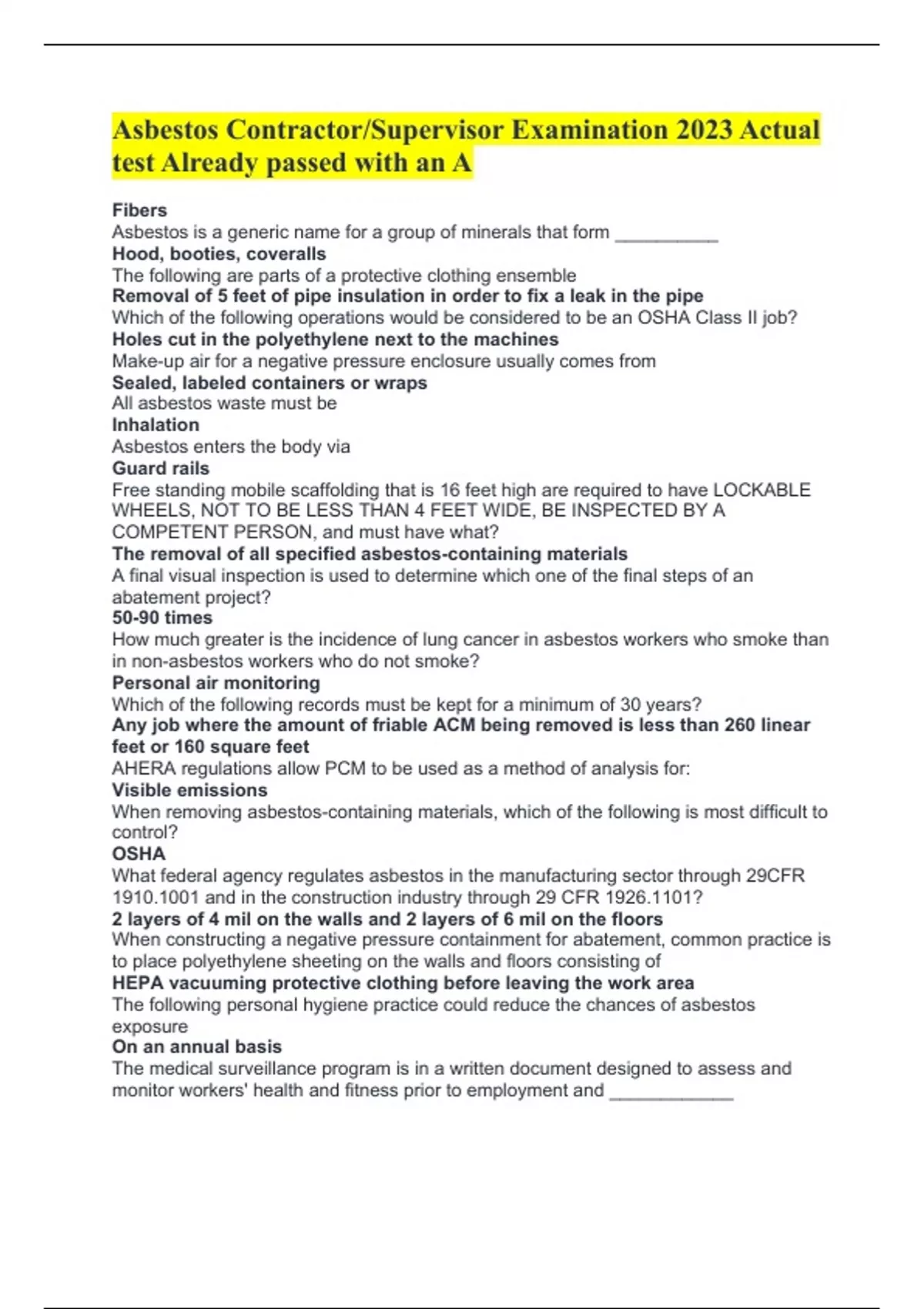 Asbestos Contractor/Supervisor Examination 2023 Actual test Already passed with an A