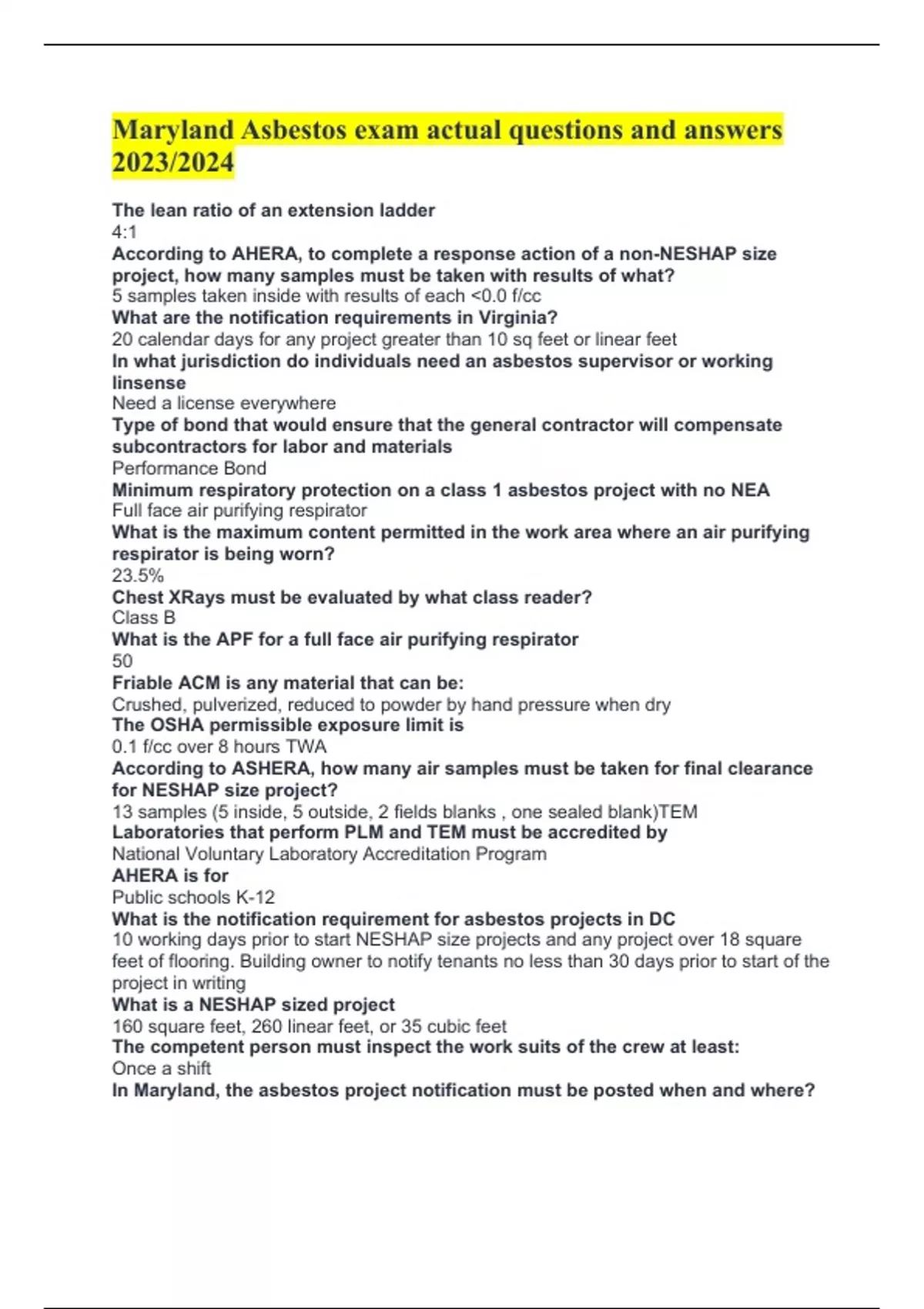 Maryland Asbestos exam actual questions and answers 2023/2024 The lean ratio of an extension ladder 4:1 According to AHERA, to complete a response action of a non-NESHAP size project, how many samples must be taken with results of what? 5 samples taken inside with results of each <0.0 f/cc What are the notification requirements in Virginia? 20 calendar days for any project greater than 10 sq feet or linear feet In what jurisdiction do individuals need an asbestos supervisor or working linsense Need a license everywhere Type of bond that would ensure that the general contractor will compensate subcontractors for labor and materials Performance Bond Minimum respiratory protection on a class 1 asbestos project with no NEA Full face air purifying respirator What is the maximum content permitted in the work area where an air purifying respirator is being worn? 23.5% Chest XRays must be evaluated by what class reader?