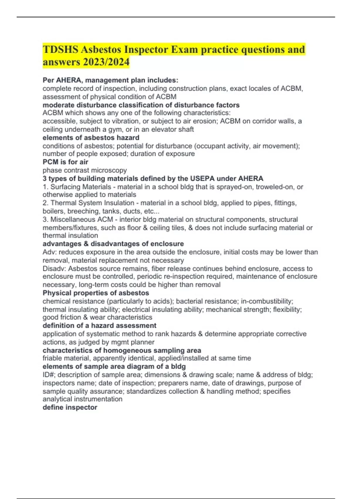 TDSHS Asbestos Inspector Exam practice questions and answers 2023/2024 Per AHERA, management plan includes: complete record of inspection, including construction plans, exact locales of ACBM, assessment of physical condition of ACBM moderate disturbance classification of disturbance factors ACBM which shows any one of the following characteristics: accessible, subject to vibration, or subject to air erosion; ACBM on corridor walls, a ceiling underneath a gym, or in an elevator shaft elements of asbestos hazard conditions of asbestos; potential for disturbance (occupant activity, air movement); number of people exposed; duration of exposure PCM is for air phase contrast microscopy 3 types of building materials defined by the USEPA under AHERA 1. Surfacing Materials - material in a school bldg that is sprayed-on, troweled-on, or otherwise applied to materials 2. Thermal System Insulation - material in a school bldg, applied to pipes, fittings, boilers, breeching, tanks, ducts, etc... 3. Miscellaneous ACM - interior bldg material on structural components, structural members/fixtures, such as floor & ceiling tiles, & does not include surfacing material or thermal insulation advantages & disadvantages of enclosure Adv: reduces exposure in the area outside the enclosure, initial costs may be lower than removal, material replacement not necessary Disadv: Asbestos source remains, fiber release continues behind enclosure, access to enclosure must be contro