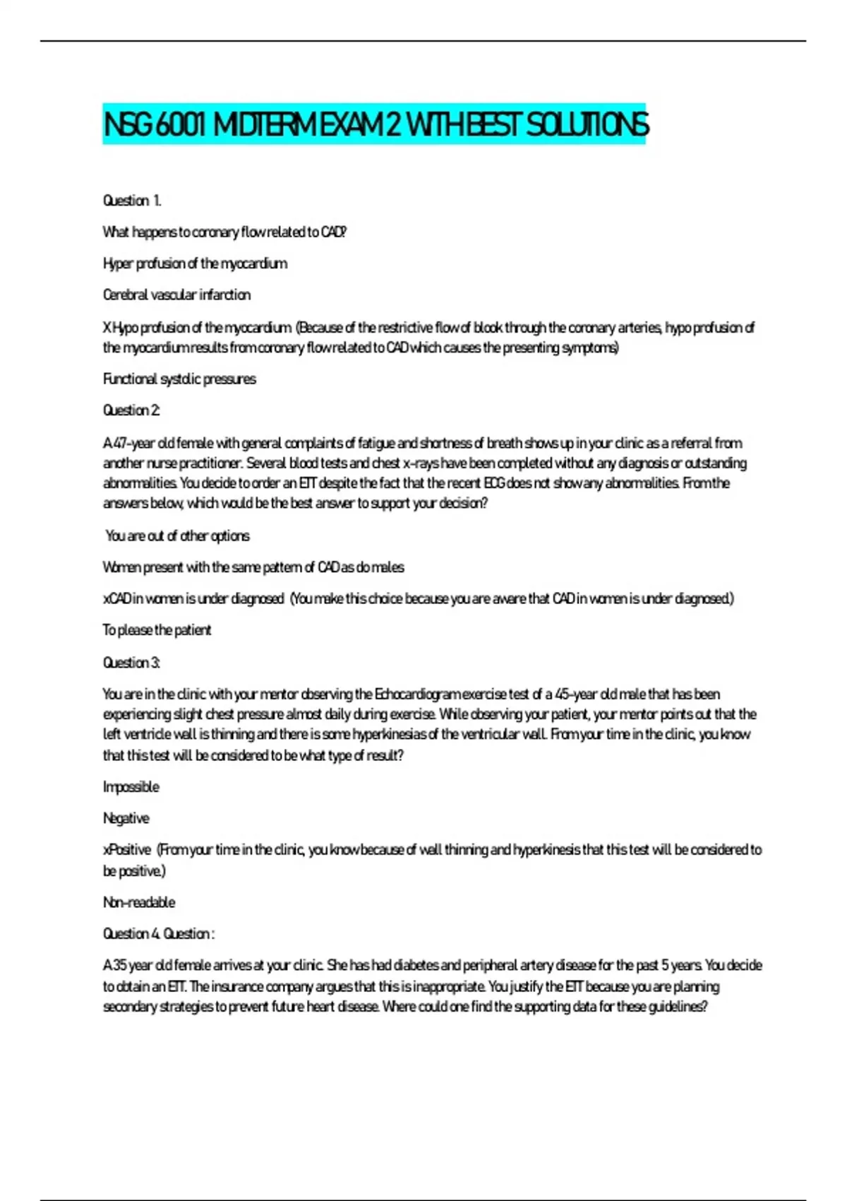 NSG 6001 MIDTERM EXAM 2 WITH BEST SOLUTIONS Question 1. What happens to coronary flow related to CAD? Hyper profusion of the myocardium Cerebral vascular infarction X Hypo profusion of the myocardium (Because of the restrictive flow of blook through the coronary arteries, hypo profusion of the myocardium results from coronary flow related to CAD which causes the presenting symptoms) Functional systolic pressures Question 2: A 47-year old female with general complaints of fatigue and shortness of breath shows up in your clinic as a referral from another nurse practitioner. Several blood tests and chest x-rays have been completed without any diagnosis or outstanding abnormalities. You decide to order an ETT despite the fact that the recent ECG does not show any abnormalities. From the answers below, which would be the best answer to support your decision? You are out of other options Women present with the same pattern of CAD as do males xCAD in women is under diagnosed (You make this choice because you are aware that CAD in women is under diagnosed.) To please the patient Question 3: You are in the clinic with your mentor observing the Echocardiogram exercise test of a 45-year old male that has been experiencing slight chest pressure almost daily during exercise. While observing your patient, your mentor points out that the left ventricle wall is thinning and there is some hyperkinesias of the ventricular wall. From your time in the clinic, you know that this test will be considered to be what type of result? Impossible Negative xPositive (From your time in the clinic, you know because of wall thinning and hyperkinesis that this test will be considered to be positive.) Non-readable Question 4. Question : A 35 year old female arrives at your clinic. She has had diabetes and peripheral artery disease for the past 5 years. You decide to obtain an ETT. The insurance company argues that this is inappropriate. You justify the ETT because you are planning secondary strategies to prevent future heart disease. Where could one find the supporting data for these guidelines? Medicare guidelines xFramingham risk score (These guidelines come from the Framingham risk score.) Medicaid guidelines Do not exist Question 5. You are counseling a patient diagnosed with stress-induced ischemia. You base your discussion on your knowledge that stressinduced ischemia is thought to be caused by what phenomena? Diet and exercise Heart muscle dysfunction Too many carbonated drinks xEndothelial dysfunction of the microvascular (You base your discussion on your knowledge that stress-induced ischemia is thought to be caused by endothelial dysfunction of the microvascular.) Question 6: On the echocardiography during the ETT you notice the following change: abnormal left ventricular ejection fraction. What do these changes suggest related to this patient? Non-ischemic changes of the baseline ECG xIschemia of the myocardium (Abnormal left ventricular ejection fraction suggests ischemia of the myocardium.) Rise in heart rate without evidence of ischemia Weak ventricular muscles Question 7: Population disease management is a term used to describe: High specificity disease states Low specificity diseases states Low prevalence specific diseases xHigh prevalence specific diseases (Population disease management is a term used to describe the high prevalence of specific diseases.) Question 8: Why would inability to exercise reduce the specificity of the routine ETT? Causes ST-segment changes and P-wave abnormalities Will not produce any changes in ECG
