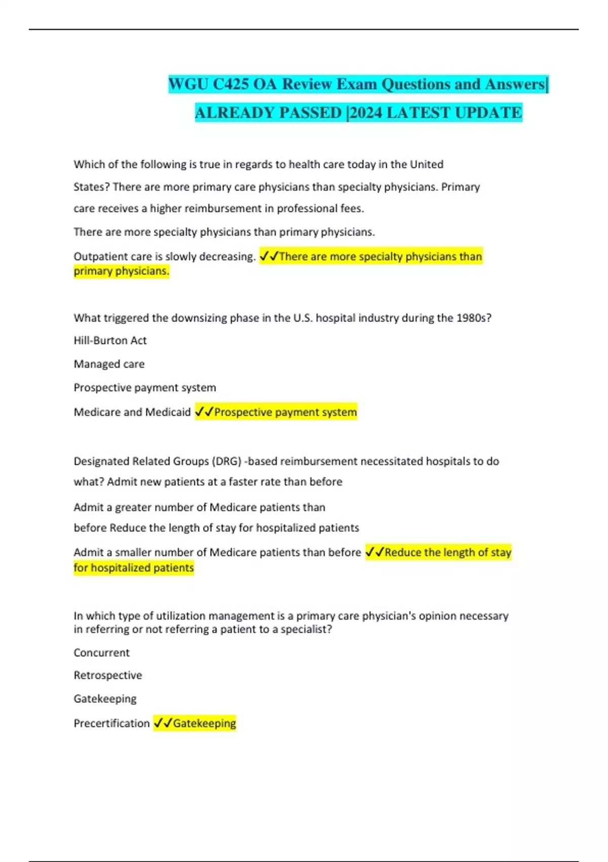 WGU C425 OA Review Exam Questions and Answers| ALREADY PASSED |2024 LATEST UPDATE Which of the following is true in regards to health care today in the United States? There are more primary care physicians than specialty physicians. Primary care receives a higher reimbursement in professional fees. There are more specialty physicians than primary physicians. Outpatient care is slowly decreasing. There are more specialty physicians than primary physicians. What triggered the downsizing phase in the U.S. hospital industry during the 1980s? Hill-Burton Act Managed care Prospective payment system Medicare and Medicaid Prospective payment system Designated Related Groups (DRG) -based reimbursement necessitated hospitals to do what? Admit new patients at a faster rate than before Admit a greater number of Medicare patients than before Reduce the length of stay for hospitalized patients Admit a smaller number of Medicare patients than before Reduce the length of stay for hospitalized patients In which type of utilization management is a primary care physician's opinion necessary in referring or not referring a patient to a specialist? Concurrent Retrospective Gatekeeping Precertification Gatekeeping