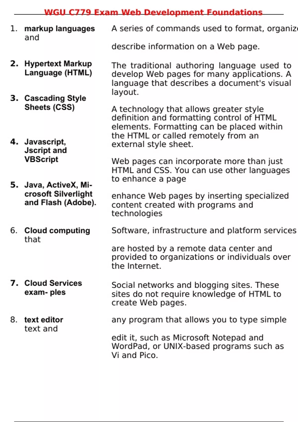 WGU C779 Exam Web Development Foundations 1. markup languages A series of commands used to format, organize and describe information on a Web page.
