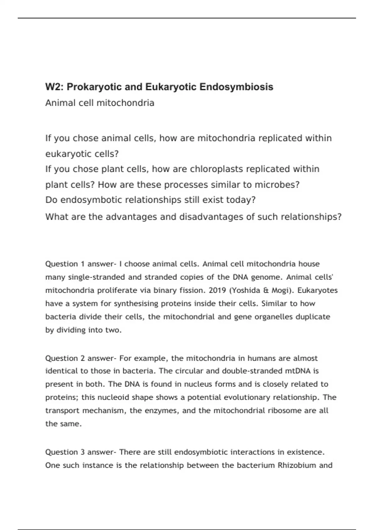 Week 2: Prokaryotic and Eukaryotic Endosymbiosis Animal cell mitochondria • If you chose animal cells, how are mitochondria replicated within eukaryotic cells? • If you chose plant cells, how are chloroplasts replicated within plant cells? How are these processes similar to microbes? • Do endosymbotic relationships still exist today? • What are the advantages and disadvantages of such relationships?