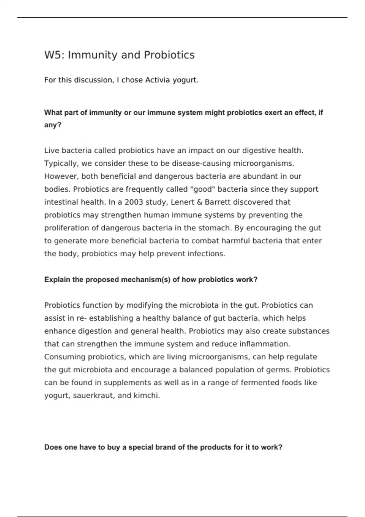 Week 5: Immunity and Probiotics For this discussion, I chose Activia yogurt. 1. What part of immunity or our immune system might probiotics exert an effect, if any? 2. Explain the proposed mechanism(s) of how probiotics work? 3. Does one have to buy a special brand of the products for it to work? 4. You only chose one of the topics, but what is the common denominator from all of them (it's a microbe)?