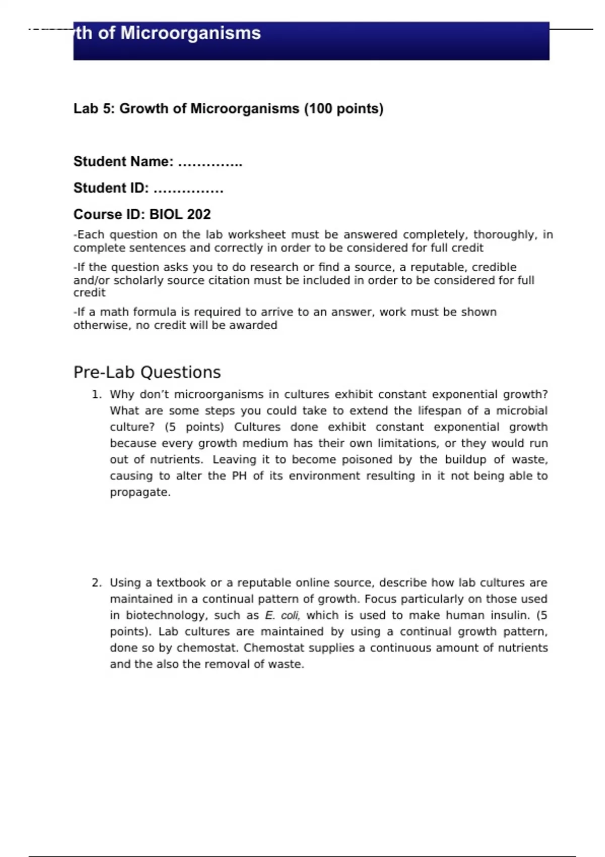 Lab 5: Growth of Microorganisms (100 points) Each question on the lab worksheet must be answered completely, thoroughly, in complete sentences and correctly in order to be considered for full credit If the question asks you to do research or find a source, a reputable, credible and/or scholarly source citation must be included in order to be considered for full credit If a math formula is required to arrive to an answer, work must be shown otherwise, no credit will be awarded Pre-Lab Questions 1. Why don’t microorganisms in cultures exhibit constant exponential growth? What are some steps you could take to extend the lifespan of a microbial culture? (5 points) 2. Using a textbook or a reputable online source, describe how lab cultures are maintained in a continual pattern of growth. Focus particularly on those used in biotechnology, such as E. coli, which is used to make human insulin. (5 points). 3. What are the four phases of bacterial growth in a closed system? (5 points) 4. What are the physical and chemical methods of microbial control and what are the two methods used? (5 points). 5. You are a physician trying to isolate bacterial colonies from the human gut in attempt to diagnose a gastrointestinal infection. You streak your sample on a growth media containing glucose, amino acids, and salts that contain both sulfur and phosphorous with a pH of 7. You incubate the plates in aerobic conditions at 37 ˚C for three days, at which point you can see clear bacterial colonies forming on the plate. .Experiment 1 Results Tables Table 1: Experiment 1 Results (10 points) Experiment 1 Post-Lab Questions 1. What does the pink band in the FTM indicate? (5 points). 2. What would be the effect of using FTM tubes with a broad pink zone? (5 points). 3. Provide an explanation as to why bacteria from each location displayed their pattern of growth. Are there any results that surprise you? If so, why? (5 points). 4. Why is it important to pull the inoculating needle out of the FTM via the same path you inserted it? (5 points). 5. Why was it necessary to have separate controls for the agar plates and the FTM tubes? (5 points). 6. Experiment 2 Results Tables Table 2: Experiment 2 Results (10 points) Experiment 2 Post-Lab Questions 1. Which germicide was most effective for each sample? Was the same germicide the most effective for microorganisms isolated from the different sources? 2. Which germicide was least effective? Was the same germicide the least effective for microorganisms isolated from the different sources? What could explain this similarity or difference? (5 points). 3. Were any of the cultured microorganisms particularly resistant to the germicides tested? If so, which culture? What could explain this strong resistance? (5 points). 4. What was the purpose of the dipped piece of filter paper in deionized water plate? (5 points). 5. Research the chemical formulas for bleach, isopropyl alcohol, and chlorhexidine gluconate (the active ingredient in Hibiclens®). How does each chemical achieve its germicidal properties on the molecular level? (5 points). 6. What are some real-world applications for a study like this? For instance, how would these results influence cleaning practices in a doctor’s office or treatment of a disease? (5 points).