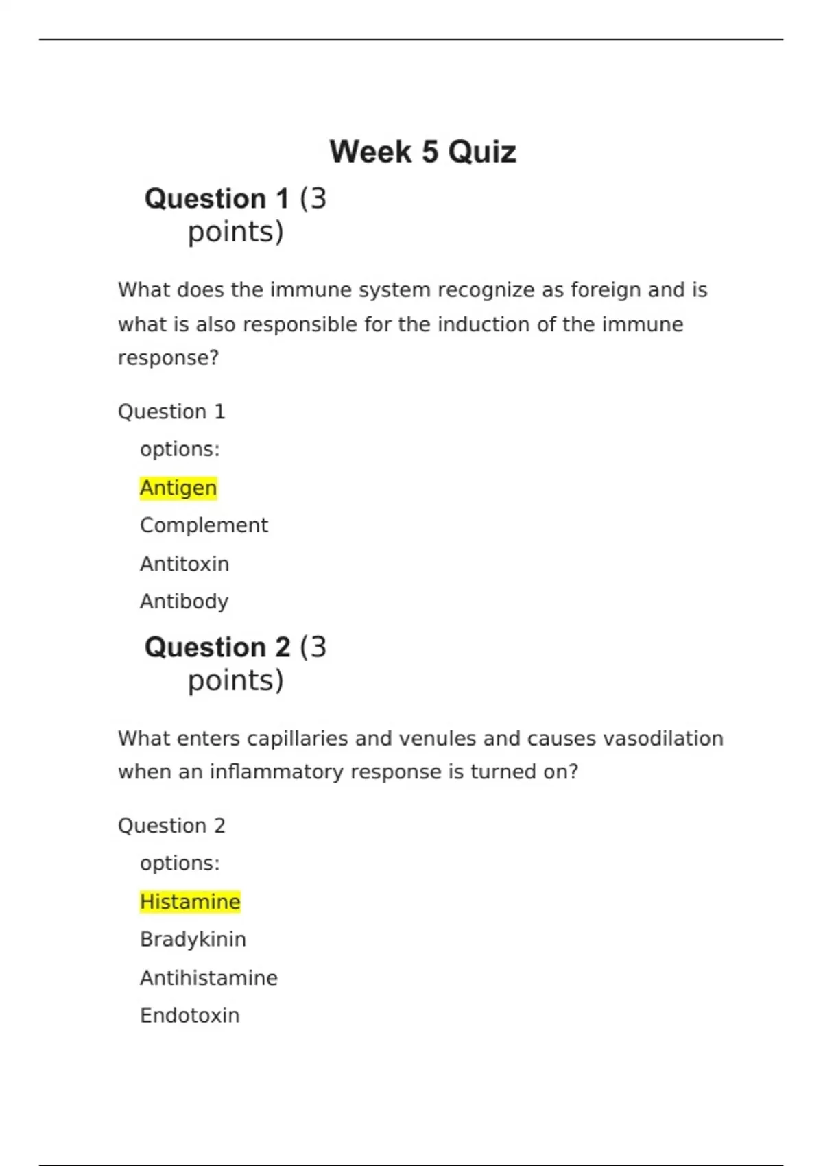 1. Question: What does the immune system recognize as foreign and is what is also responsible for the induction of the immune response? 2. Question: What enters capillaries and venules and causes vasodilation when an inflammatory response is turned on? 3. Question: What describes how a host defends itself against an invading pathogen? 4. Question: What is excluded in the group of cellular defenses of macrophage? 5. Question: How are antigens described? 6. Question: What cells specialize to non-specifically kill virus infected cells? 7. Question: What is the correct order of events that must occur for a phagocyte to destroy an invading pathogen? 8. Question: What is eliminated as a reason why the eyes are missing resident microflora? 9. Question: What cell-type is excluded from the T lymphocytes group? 10. Question: Which statement is incorrect regarding Candida albicans?