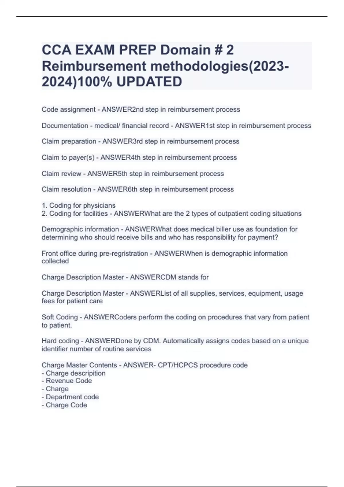 CCA EXAM PREP Domain # 2 Reimbursement methodologies()100% UPDATED