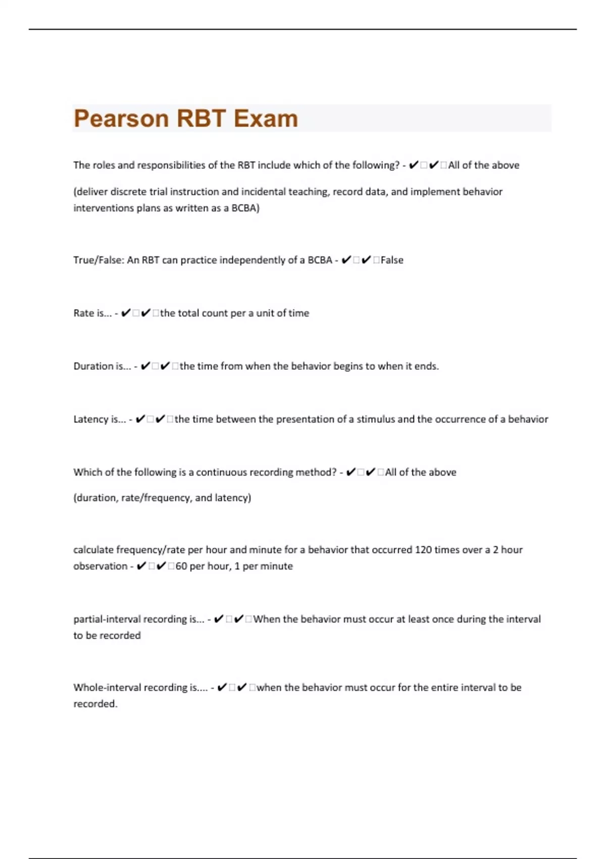 The roles and responsibilities of the RBT include which of the following? - ️️All of the above (deliver discrete trial instruction and incidental teaching, record data, and implement behavior interventions plans as written as a BCBA) True/False: An RBT can practice independently of a BCBA - ️️False Rate is... - ️️the total count per a unit of time Duration is... - ️️the time from when the behavior begins to when it ends. Latency is... - ️️the time between the presentation of a stimulus and the occurrence of a behavior Which of the following is a continuous recording method? - ️️All of the above (duration, rate/frequency, and latency) calculate frequency/rate per hour and minute for a behavior that occurred 120 times over a 2 hour observation - ️️60 per hour, 1 per minute partial-interval recording is... - ️️When the behavior must occur at least once during the interval to be recorded Whole-interval recording is.... - ️️when the behavior must occur for the entire interval to be recorded.