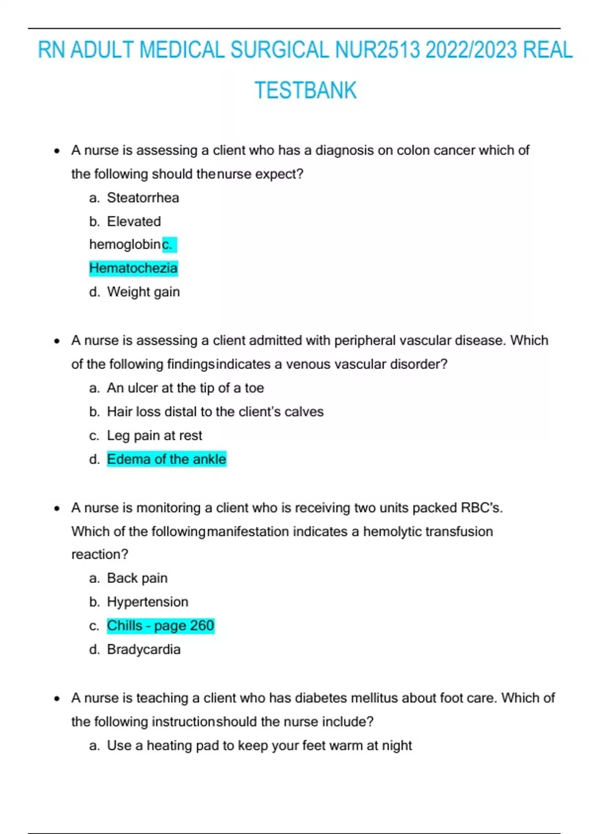 RN ADULT MEDICAL SURGICAL NUR/2023 REAL TESTBANK A nurse is assessing a client who has a diagnosis on colon cancer which of the following should thenurse expect? a. Steatorrhea b. Elevated hemoglobinc. Hematochezia d. Weight gain A nurse is assessing a client admitted with peripheral vascular disease. Which of the following findingsindicates a venous vascular disorder? a. An ulcer at the tip of a toe b. Hair loss distal to the client’s calves c. Leg pain at rest d. Edema of the ankle A nurse is monitoring a client who is receiving two units packed RBC's. Which of the followingmanifestation indicates a hemolytic transfusion reaction? a. Back pain b. Hypertension c. Chills – page 260 d. Bradycardia
