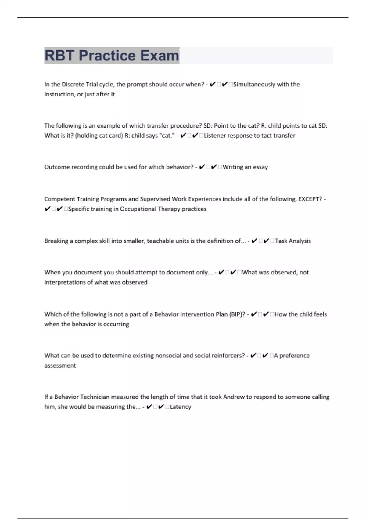 In the Discrete Trial cycle, the prompt should occur when? - ️️Simultaneously with the instruction, or just after it The following is an example of which transfer procedure? SD: Point to the cat? R: child points to cat SD: What is it? (holding cat card) R: child says "cat." - ️️Listener response to tact transfer Outcome recording could be used for which behavior? - ️️Writing an essay Competent Training Programs and Supervised Work Experiences include all of the following, EXCEPT? - ️️Specific training in Occupational Therapy practices Breaking a complex skill into smaller, teachable units is the definition of... - ️️Task Analysis When you document you should attempt to document only... - ️️What was observed, not interpretations of what was observed Which of the following is not a part of a Behavior Intervention Plan (BIP)? - ️️How the child feels when the behavior is occurring What can be used to determine existing nonsocial and social reinforcers? - ️️A preference assessment If a Behavior Technician measured the length of time that it took Andrew to respond to someone calling him, she would be measuring the... - ️️Latency