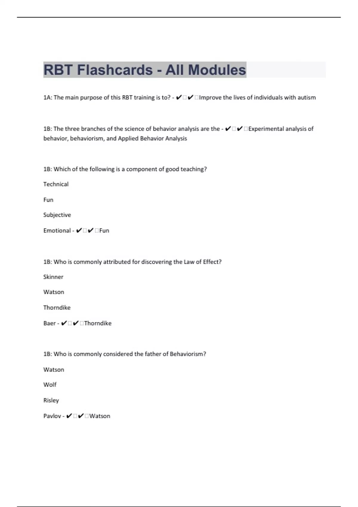 1A: The main purpose of this RBT training is to? - ️️Improve the lives of individuals with autism 1B: The three branches of the science of behavior analysis are the - ️️Experimental analysis of behavior, behaviorism, and Applied Behavior Analysis 1B: Which of the following is a component of good teaching? Technical Fun Subjective Emotional - ️️Fun 1B: Who is commonly attributed for discovering the Law of Effect? Skinner Watson Thorndike Baer - ️️Thorndike 1B: Who is commonly considered the father of Behaviorism? Watson Wolf Risley Pavlov - ️️Watson