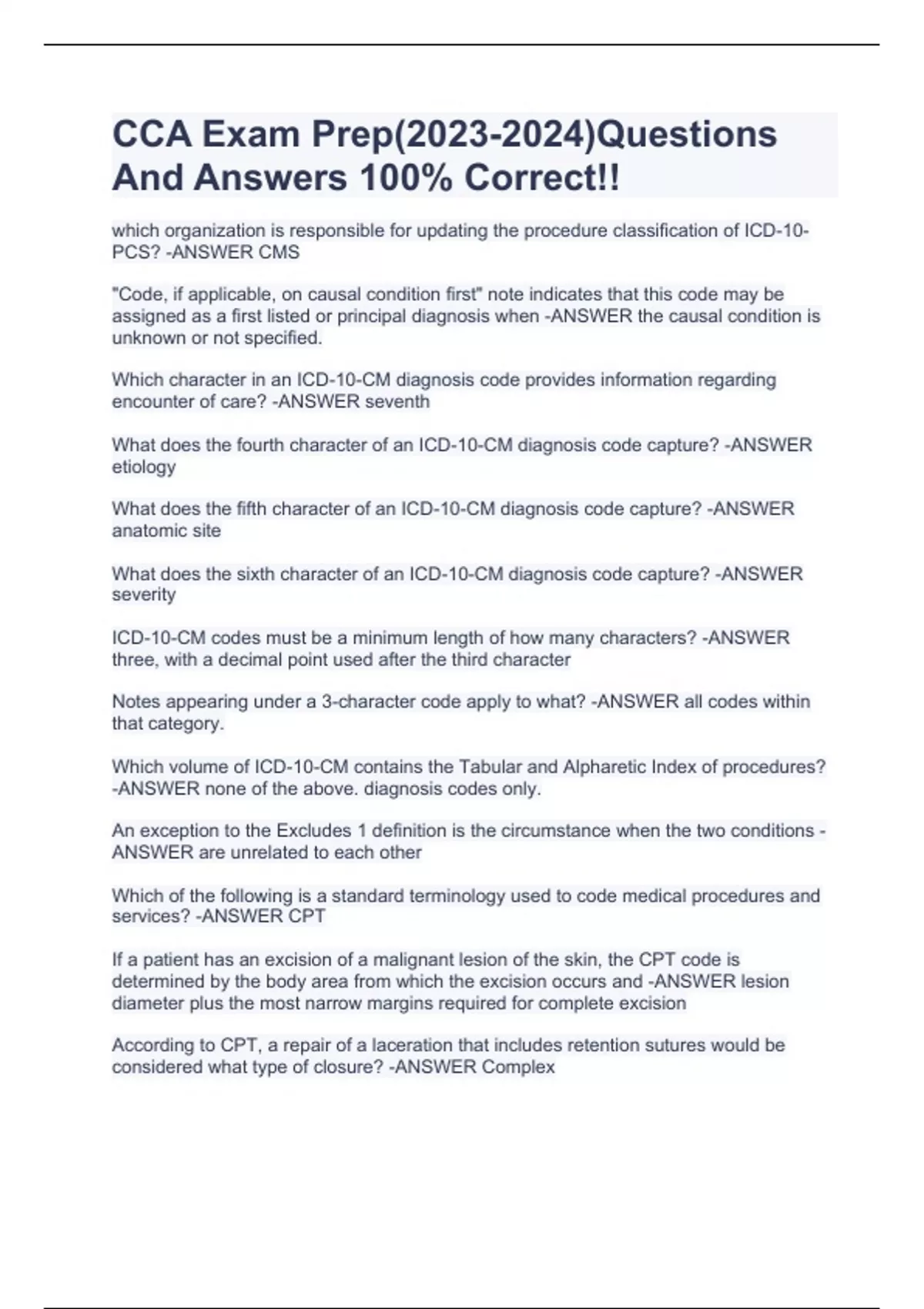 which organization is responsible for updating the procedure classification of ICD-10-PCS? -ANSWER CMS "Code, if applicable, on causal condition first" note indicates that this code may be assigned as a first listed or principal diagnosis when -ANSWER the causal condition is unknown or not specified. Which character in an ICD-10-CM diagnosis code provides information regarding encounter of care? -ANSWER seventh What does the fourth character of an ICD-10-CM diagnosis code capture? -ANSWER etiology What does the fifth character of an ICD-10-CM diagnosis code capture? -ANSWER anatomic site What does the sixth character of an ICD-10-CM diagnosis code capture? -ANSWER severity ICD-10-CM codes must be a minimum length of how many characters? -ANSWER three, with a decimal point used after the third character