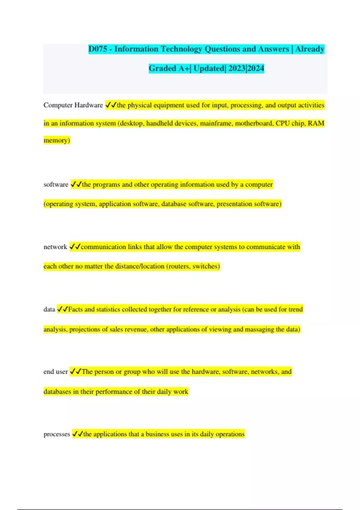 D075 - Information Technology Questions and Answers | Already Graded A+| Updated| 2023|2024