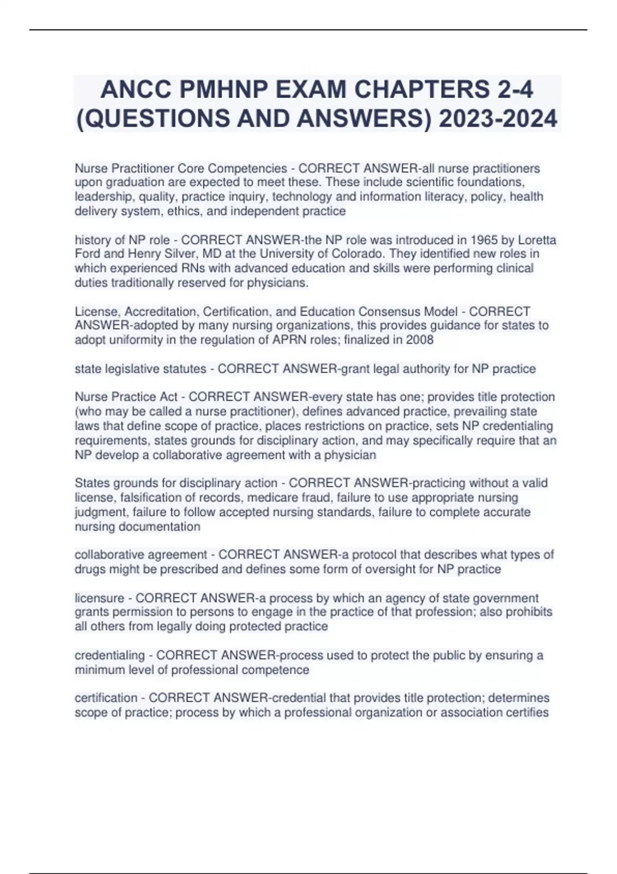 ANCC PMHNP EXAM CHAPTERS 2-4 (QUESTIONS AND ANSWERS) Nurse Practitioner Core Competencies - CORRECT ANSWER-all nurse practitioners upon graduation are expected to meet these. These include scientific foundations, leadership, quality, practice inquiry, technology and information literacy, policy, health delivery system, ethics, and independent practice history of NP role - CORRECT ANSWER-the NP role was introduced in 1965 by Loretta Ford and Henry Silver, MD at the University of Colorado. They identified new roles in which experienced RNs with advanced education and skills were performing clinical duties traditionally reserved for physicians. License, Accreditation, Certification, and Education Consensus Model - CORRECT ANSWER-adopted by many nursing organizations, this provides guidance for states to adopt uniformity in the regulation of APRN roles; finalized in 2008 state legislative statutes - CORRECT ANSWER-grant legal authority for NP practice Nurse Practice Act - CORRECT ANSWER-every state has one; provides title protection (who may be called a nurse practitioner), defines advanced practice, prevailing state laws that define scope of practice, places restrictions on practice, sets NP credentialing requirements, states grounds for disciplinary action, and may specifically require that an NP develop a collaborative agreement with a physician States grounds for disciplinary action - CORRECT ANSWER-practicing without a valid license, falsification of records, medicare fraud, failure to use appropriate nursing judgment, failure to follow accepted nursing standards, failure to complete accurate nursing documentation collaborative agreement - CORRECT ANSWER-a protocol that describes what types of drugs might be prescribed and defines some form of oversight for NP practice licensure - CORRECT ANSWER-a process by which an agency of state government grants permission to persons to engage in the practice of that profession; also prohibits all others from legally doing protected practice credentialing - CORRECT ANSWER-process used to protect the public by ensuring a minimum level of professional competence certification - CORRECT ANSWER-credential that provides title protection; determines scope of practice; process by which a professional organization or association certifies that a person licensed to practice as a professional meets set standards, assures public of mastery, assures person has acquired necessary skills scope of practice - CORRECT ANSWER-defines NP roles and actions; identifies competencies assumed to be held by all NPs who function in a particular role; varies broadly from state to state standards of practice - CORRECT ANSWER-authoritative statements regarding the quality and type of practice that should be provided; provide a way to judge nature of care provided; can be used to legally describe standard of care that must be met by a provider; may be precise protocols or more general guidelines confidentiality - CORRECT ANSWER-client's right to assume that info given to provider will not be disclosed, protected under federal stature through the Medical Record Confidentiality Act of 1995; pertains to written and verbal info; requires provider obtain signed medical authorization and consent forms to release medical records and info when requested by client or another healthcare provider HIPAA - CORRECT ANSWER-guarantees clients four fundamental rights: to be educated about privacy protection, to have access to their own medical records, to request amendment of their health info to which they object, and to require their permission for disclosure of their personal info HITECH - CORRECT ANSWER-health information technology for economic and clinical health act of 2009; incentive payments for sharing specific EHR data, meaningful use incentives exceptions to guaranteed confidentiality - CORRECT ANSWER-when appropriate person or organizations determine that the need for info outweighs principle of confidentiality, if a client reveals an intent to harm self or others, info given to attorneys involved in litigation, releasing records to insurance companies, answering court orders, subpoenas, or summons, meeting state requirements for mandatory reporting of diseases or conditions, Tarasoff principle, in cases of elder or child abuse informed consent - CORRECT ANSWER-communication process between provider and client that results in client's acceptance or rejection of proposed treatment; right of all competent adults and emancipated minors emancipated minor - CORRECT ANSWER-persons younger than 18 who are married, parents, or self-sufficiently living away from the family domicile elements of informed consent - CORRECT ANSWER-must include nature/purpose of tx, risks/benefits of tx, risks/benefits of NOT doing tx, alternative tx, diagnosis and prognosis. Provider must document in medical record that informed consent has been obtained from client justice - CORRECT ANSWER-doing what is fair; fairness in all aspects of care beneficence - CORRECT ANSWER-promoting well-being and doing good nonmaleficence - CORRECT ANSWER-doing no harm fidelity - CORRECT ANSWER-being true and loyal autonomy - CORRECT ANSWER-doing for self veracity - CORRECT ANSWER-telling the truth respect - CORRECT ANSWER-treating everyone with equal respect deontological theory - CORRECT ANSWER-an action is judged as good or bad based on the act itself regardless of the consequences teleological theory - CORRECT ANSWER-an action is judged as good or bad based on consequence or outcome virtue ethics - CORRECT ANSWER-actions are chosen based on moral virtue or the character of the person making the decision malpractice insurance - CORRECT ANSWER-provides financial protection against claims of malpractice (coverage for negligence and for highly technical or professional skills required by NPS), recommended universally for all NPs, does not protect NPs from charges of practicing outside scope of practice, provides NPs their own leg