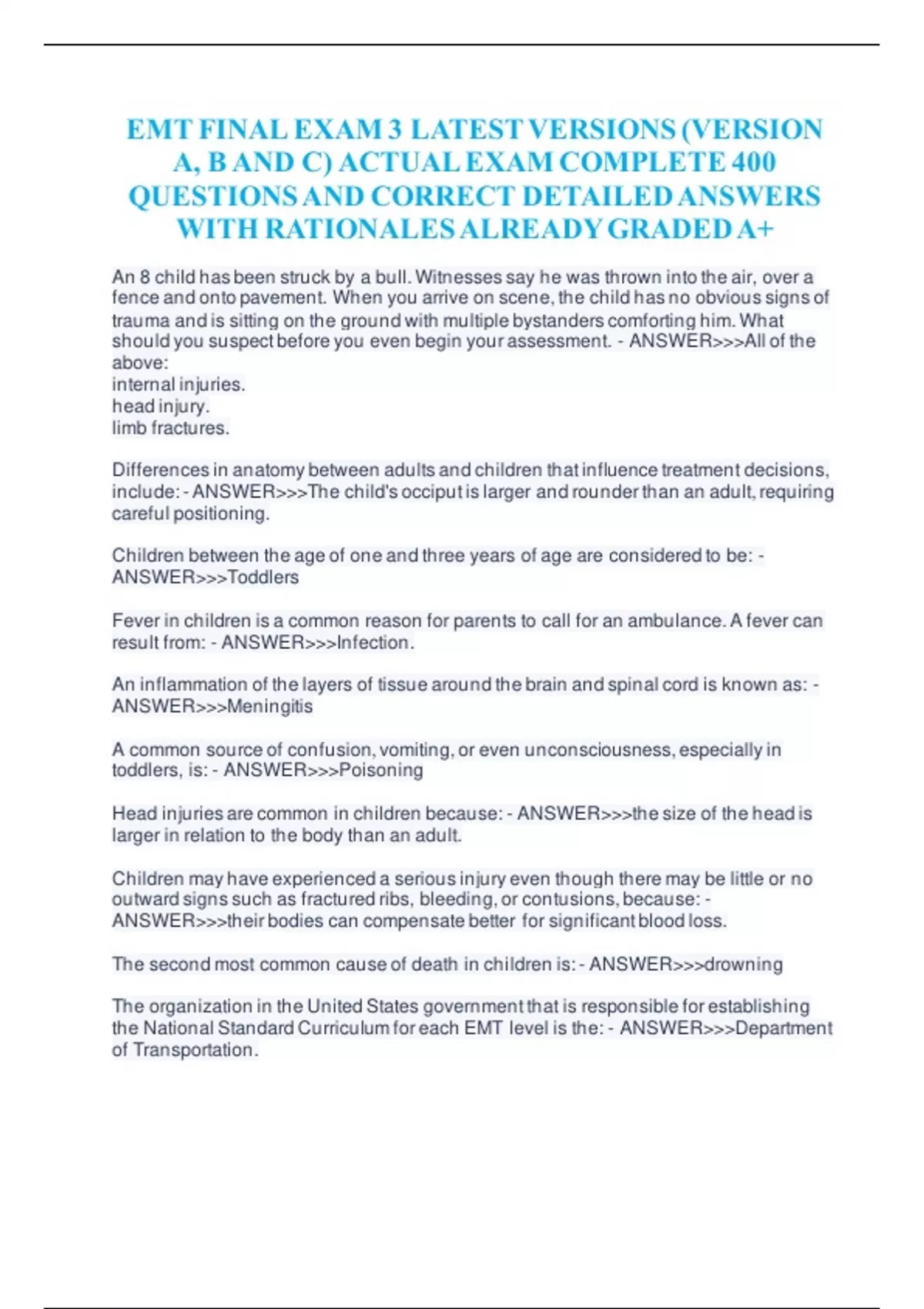 EMT FINAL EXAM 3 LATEST VERSIONS (VERSION A, B AND C) ACTUAL EXAM COMPLETE